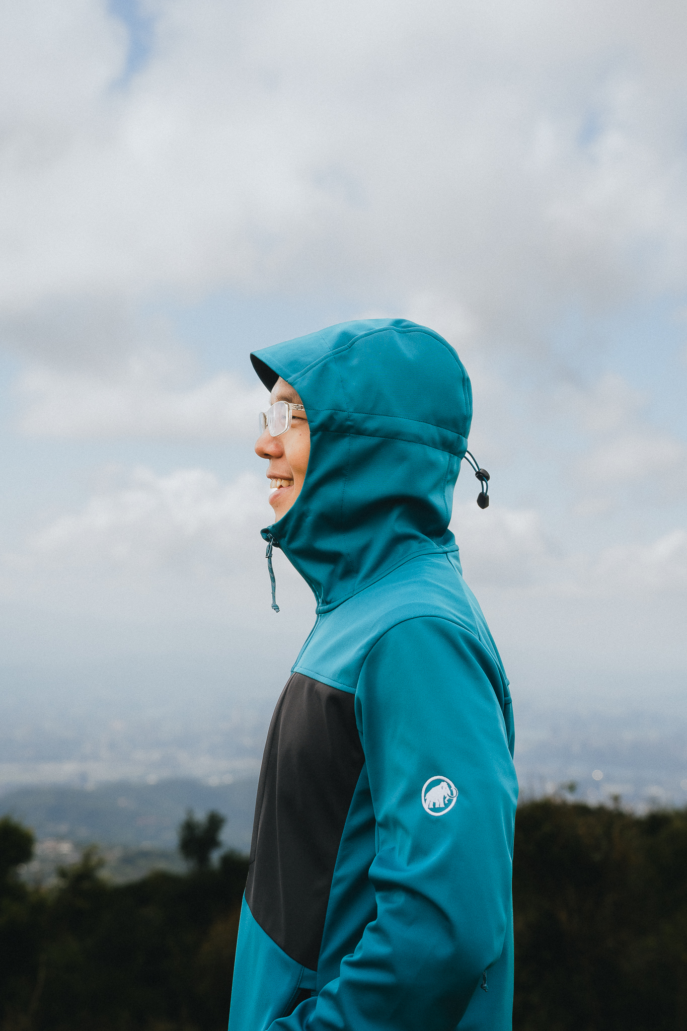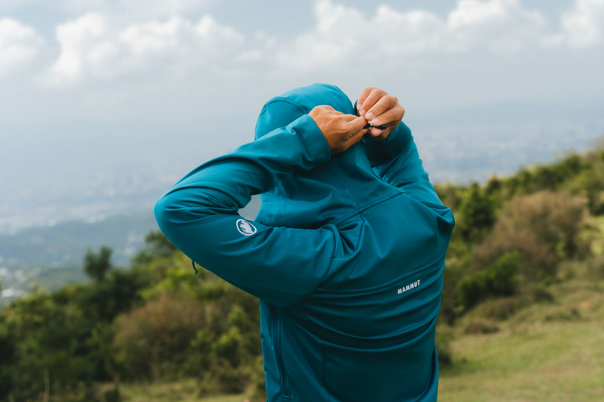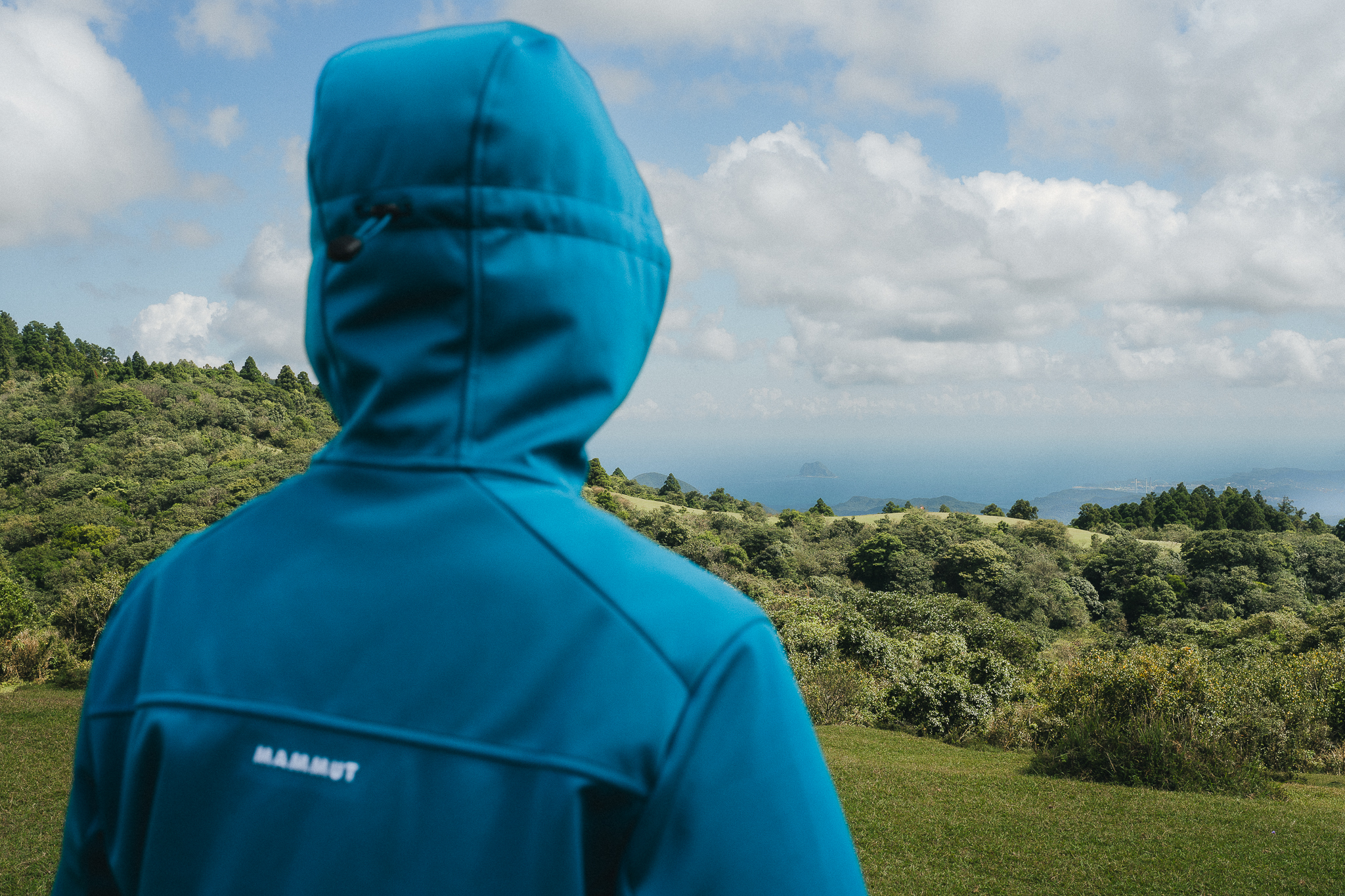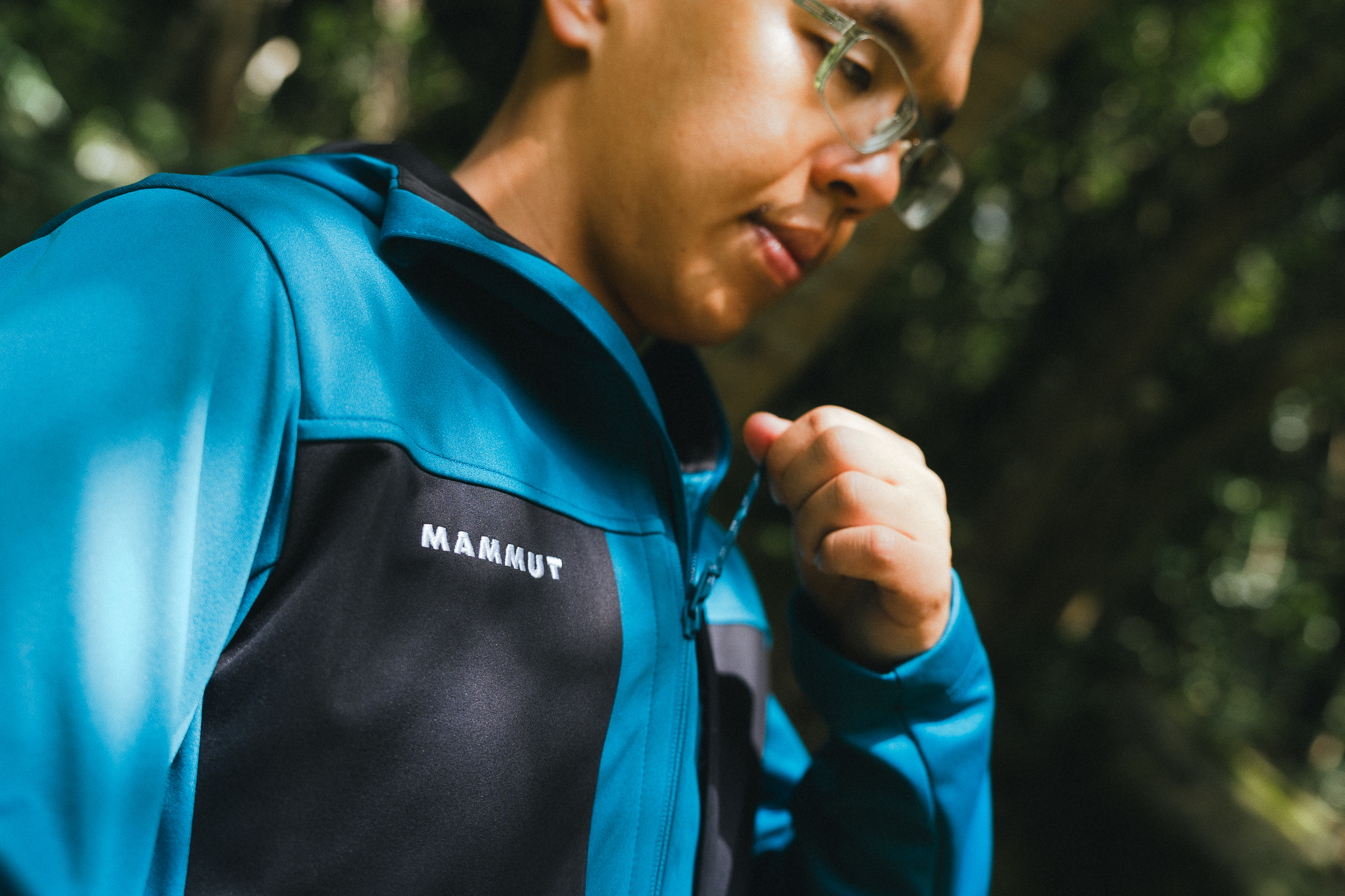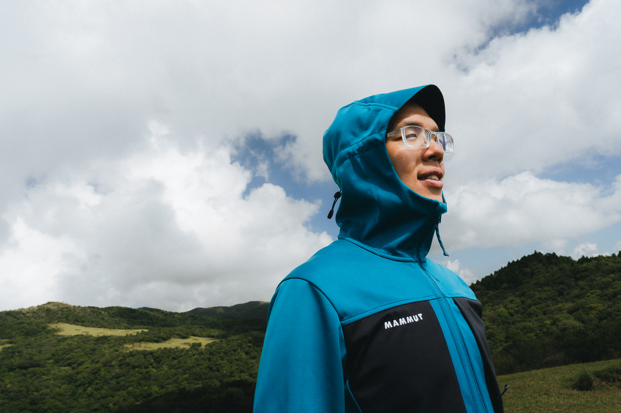 Mammut Ultimate VIII SO 剪裁貼身卻具備高自由度,「我個人挑選的尺寸屬於偏大一點,在內層我會多穿一些薄的保暖衣物,但我會建議挑選時一定要試穿過,每個人登山習慣不同,可以依照自己穿衣服的活動度習慣,走路舒適度,像是攀爬手會舉高等動作,都是挑選軟殼外套要注意的點。」