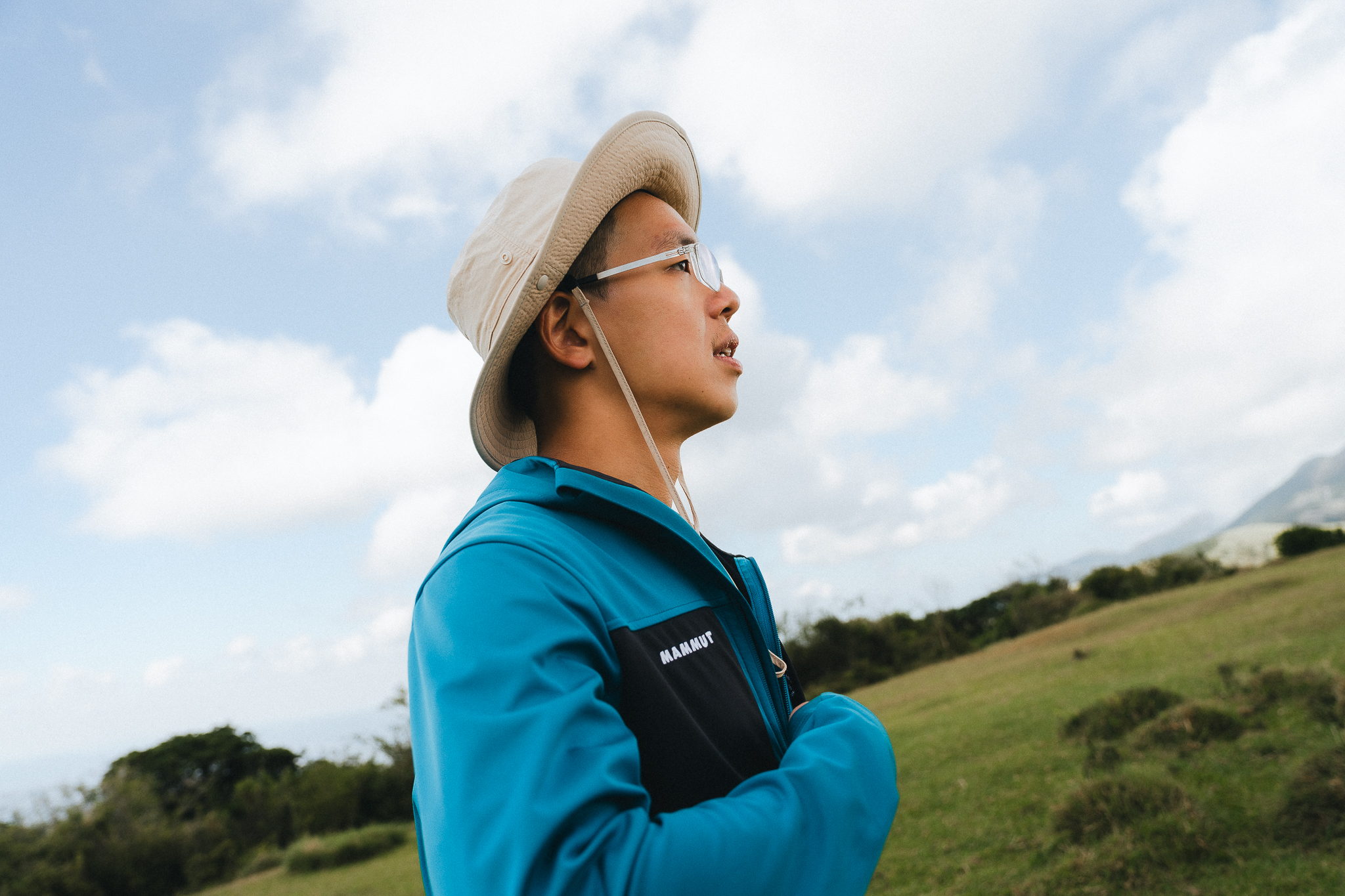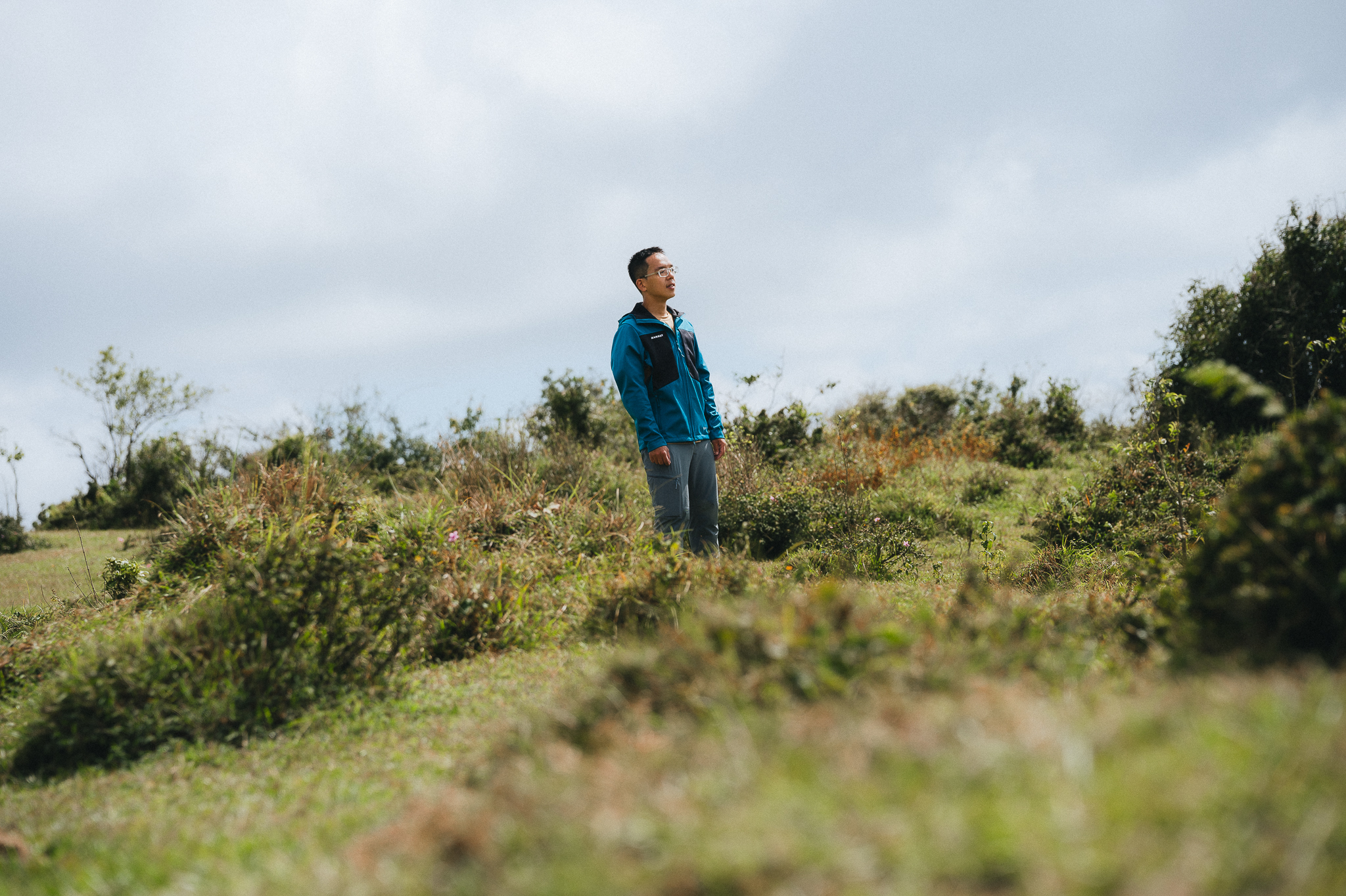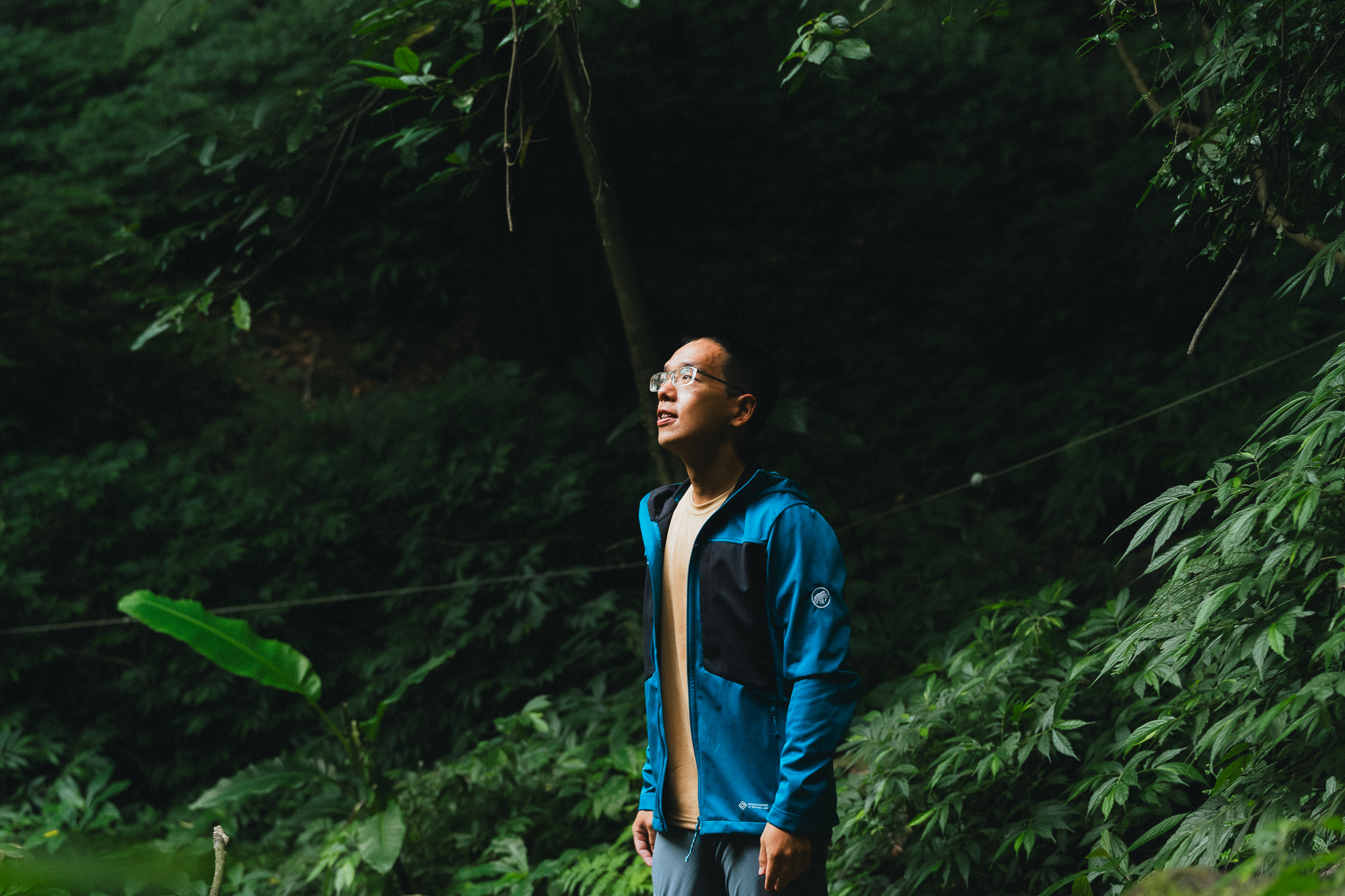 拍攝這天清晨,我們相約在北五指山的登山口碰面,景淮背著隔日要帶團 20 多公斤的裝備,ㄧ邊簡單調整肩帶,一邊和我們點頭致意,口氣平靜地問好,完全看不出來幾天前他才結束一趟馬太鞍溪堰塞湖的任務,那是颱風重創花蓮後,全台最關注也最危險的災區前線。與此同時,也讓人忍不住好奇,眼前這位年僅 25 歲的年輕男子,他是怎麼與山相遇,背後又有什麼樣的登山故事。
