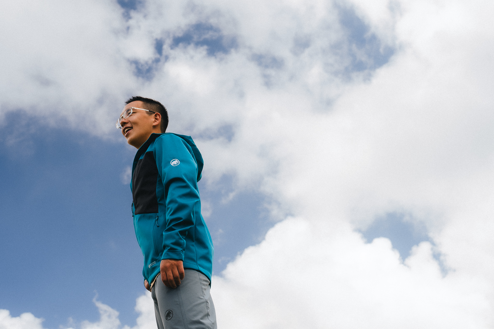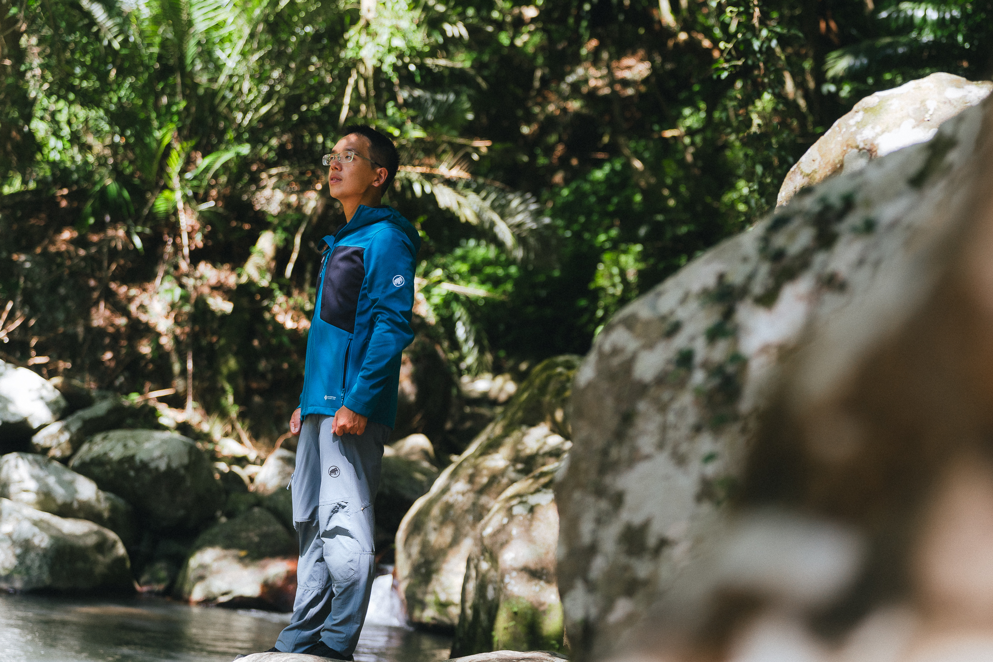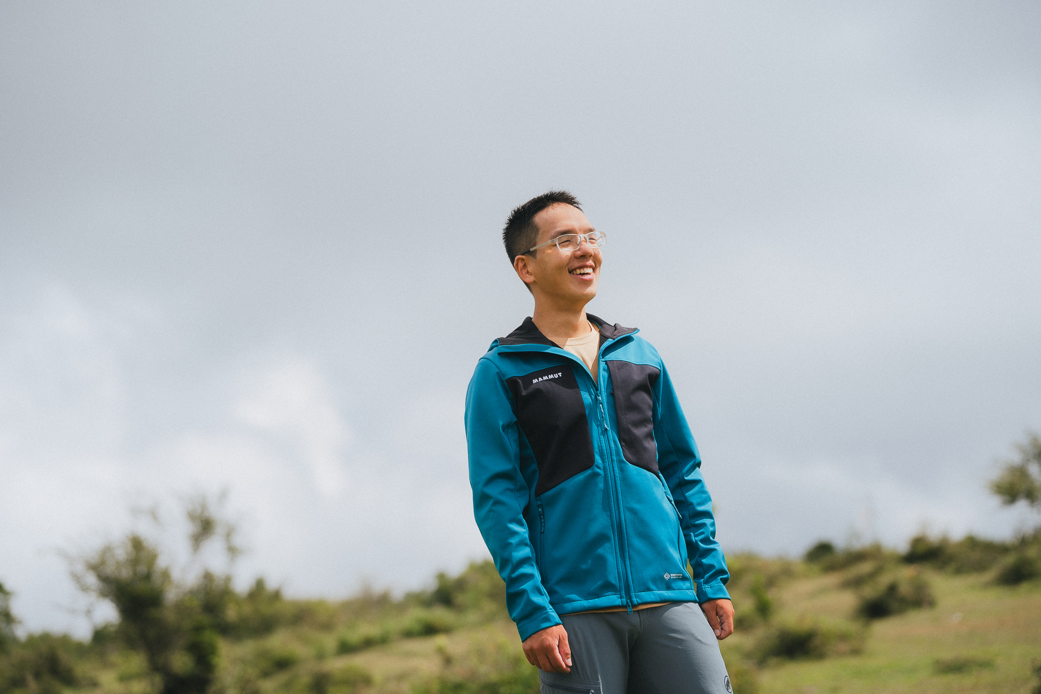 在這次拍攝中,他穿上了 Mammut Ultimate VIII SO 第八代經典軟殼連帽外套,他說第一印象並非外型,而是這是一件穿起來很安靜,不會打擾我做事的裝備。
