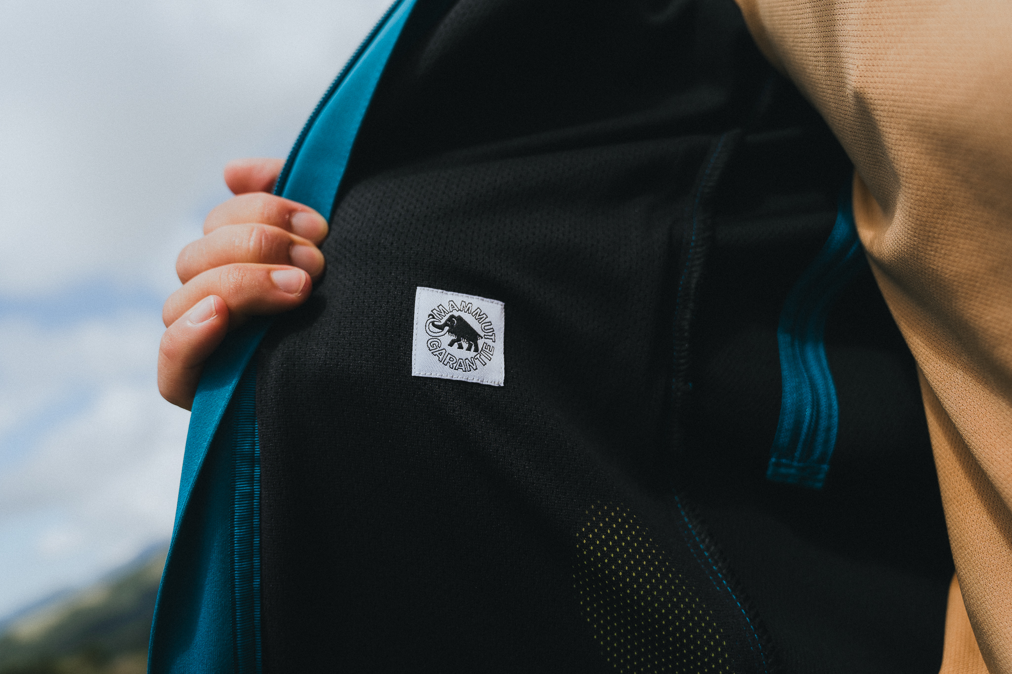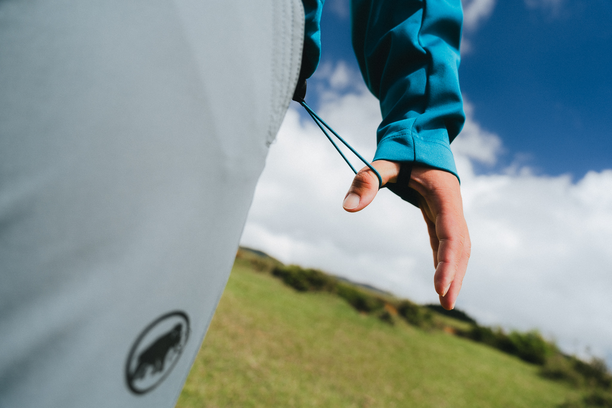 Ultimate VIII SO 的真正迷人之處,是兼顧輕量、速乾與活動自由度的平衡,不含 PFC 的 ePE 薄膜與再生聚酯纖維,在高機能之上也試圖讓製造過程更友善環境。 在設計上 Mammut 也保留了可維修性,下擺抽繩可更換、拉鍊模組可拆修,不是用壞就丟,而是修好後繼續上山,對景淮這種長時間在山中行走,需要讓裝備經得起磨損的人來說非常重要。