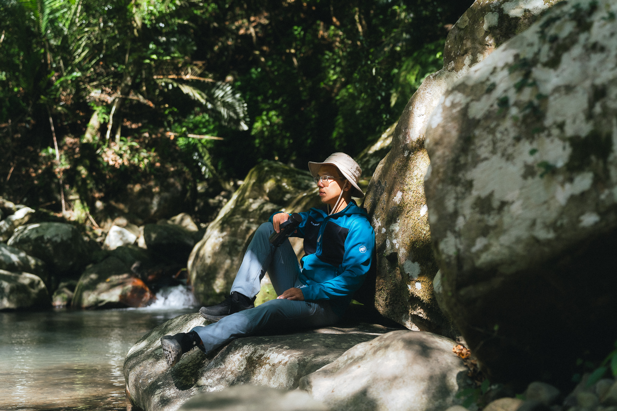 行走在未開發的山徑中,比起輕量,景淮更在意衣物能不能撐住環境,例如芒草與箭竹會刮破布料,連續幾天的濕氣會讓衣服始終乾不了,如果不夠透氣,汗水反而會變成冷意留在身上,用專業探勘的角度去看待一件軟殼外套,是為了讓人能在風雨之下,汗水與疲倦之間,仍然保持清楚判斷。