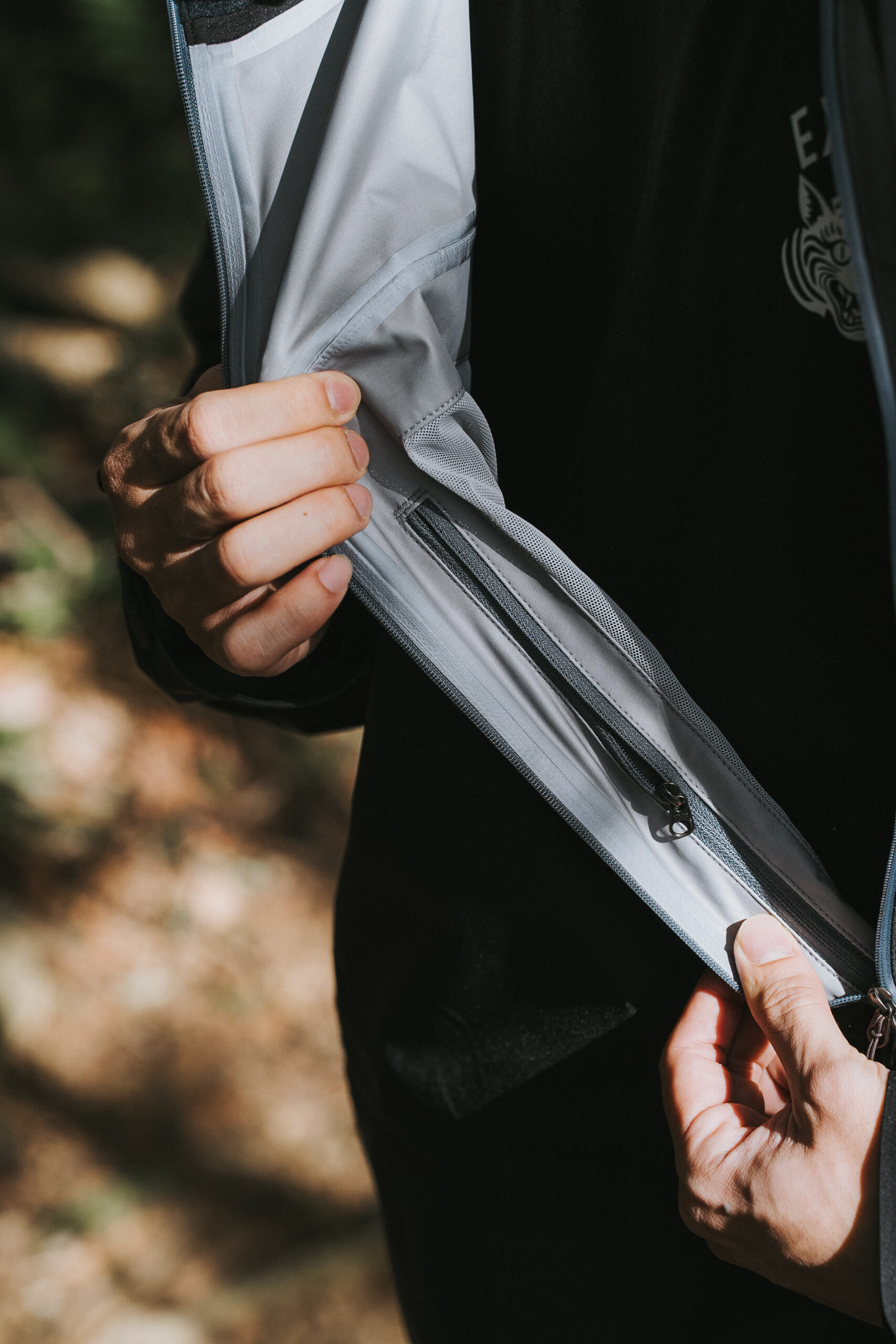 Tsurugi Jacket 斜拉外套最鮮明的設計語彙,就是胸前的斜角拉鍊,原本是為冰攀而生,能讓肩胸的活動度大幅提升,同時解決套頭款常見的穿脫不便。拉鍊拉開後形成的斜角通風設計,也是 TETON BROS. 的標誌性通風系統,能從腋下一路排出熱氣,維持身體在高強度移動中的穩定體感。