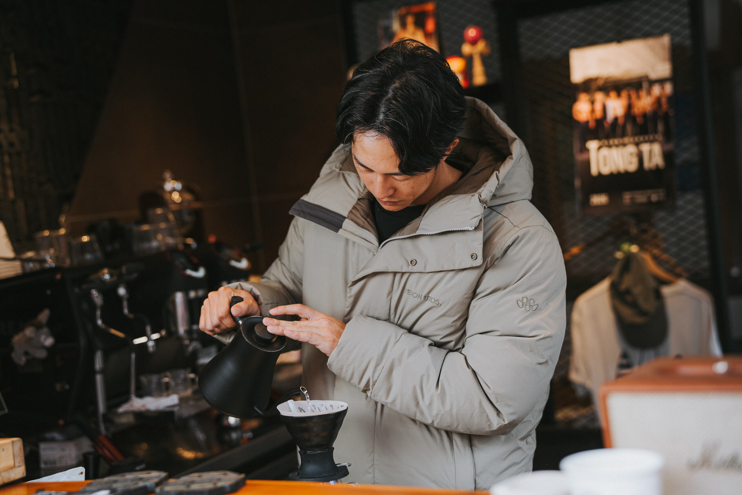 續命咖啡於是像一道入口,讓人得以認識 Hoky 如何在多重角色之間調整配速,同時也為日常續命。而當故事走向戶外,那份恆定也延伸到他身上穿著的裝備選擇。今回,他穿上日本戶外品牌 TETON BROS. 防水羽絨外套,在咖啡日常或冬季旅行中,都成了替他維持穩定體感的可靠存在。