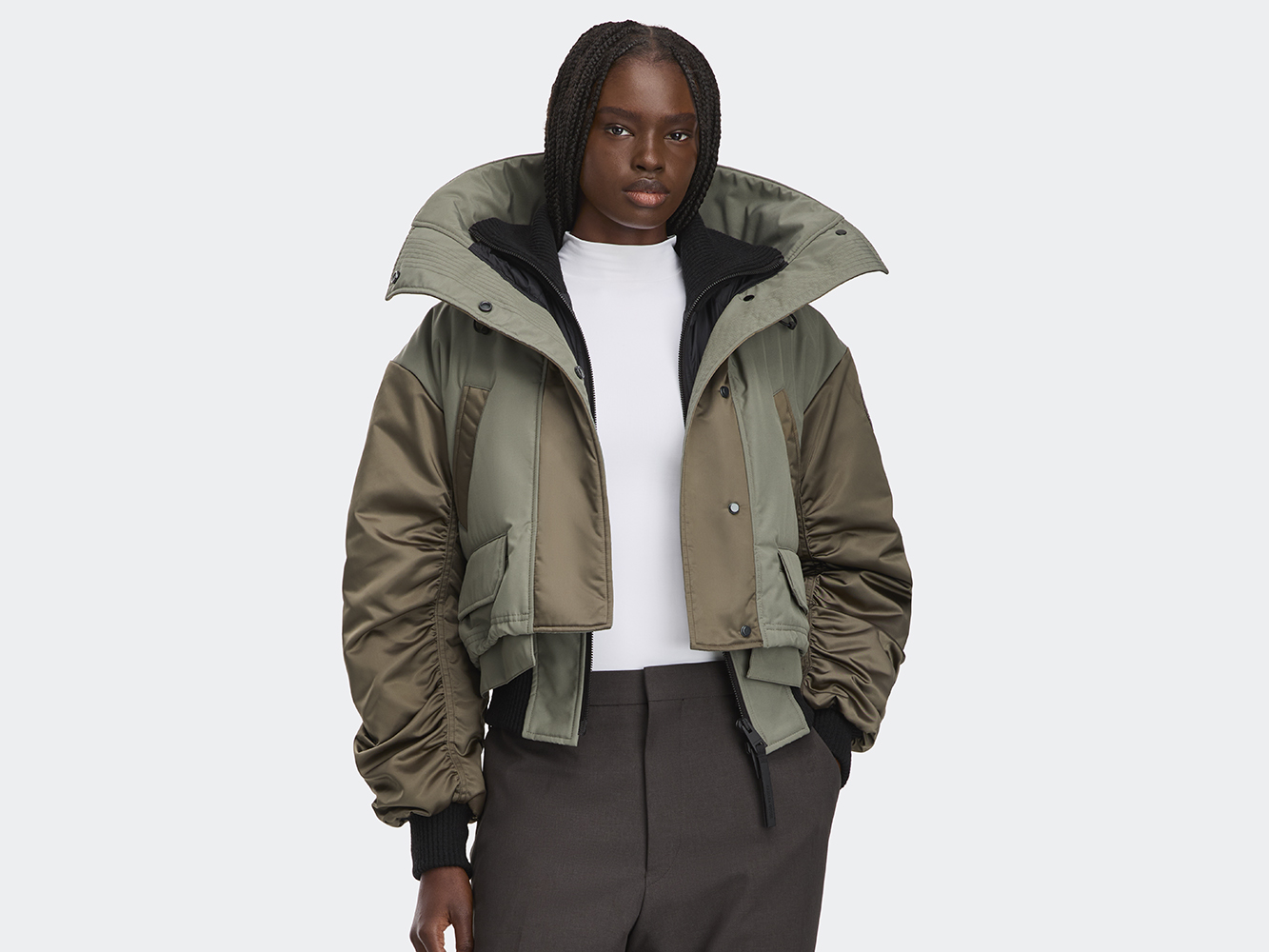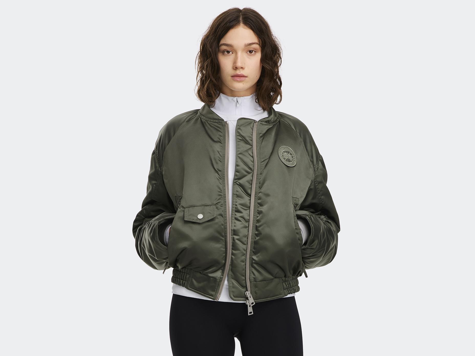 採用尼龍 Gaberdine 面料,靈感源自Canada Goose檔案室的經典緞面款,表面光滑亮澤,散發低調奢華質感。保留鬆緊腰圍與筆袋口袋設計等經典的飛行員夾克元素,以皺褶細節與光澤緞面注入現代女性化風格,將傳統輪廓與現代精緻感完美融合,呈現時尚與功能兼具的都市造型。