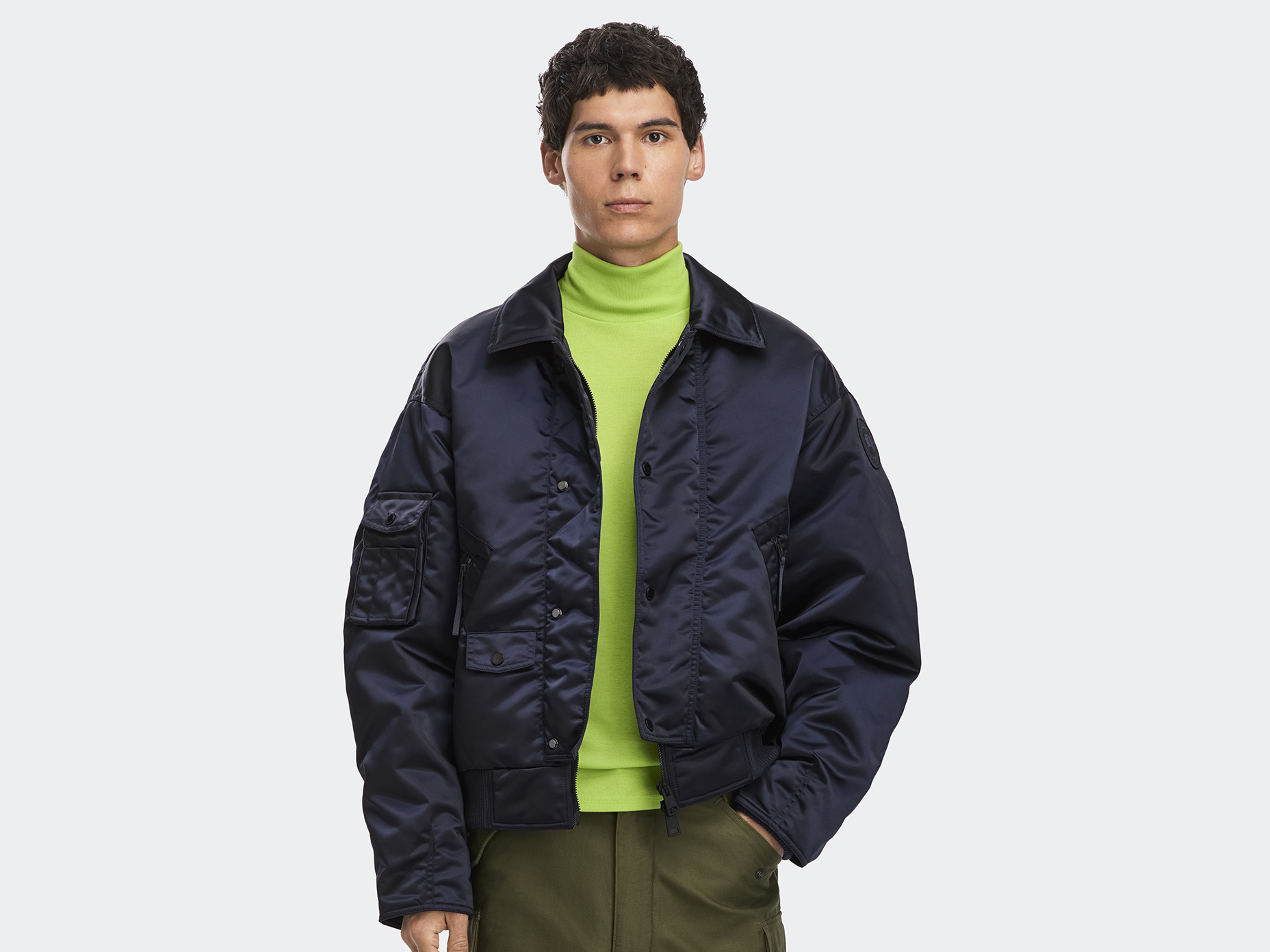 承襲逾 25 年前的經典設計脈絡,以更洗鍊的細節重塑飛行員夾克的標誌性輪廓。保留雙層門襟、筆袋與羅紋針織袖口與下擺等經典元素,同時融入更貼近當代的機能語彙。採用源自品牌歷史檔案的 Nylon Gaberdine 面料,兼具輕量、防風、防潑水與抗皺特性,呈現細緻而低調的緞面光澤;內裏延續飛行員夾克的經典橘色,源自任務中提升辨識度的實用設計,如今成為鮮明且具標誌性的時尚細節。俐落簡約的版型能輕鬆駕馭各式風格,展現純粹而果敢的現代魅力。