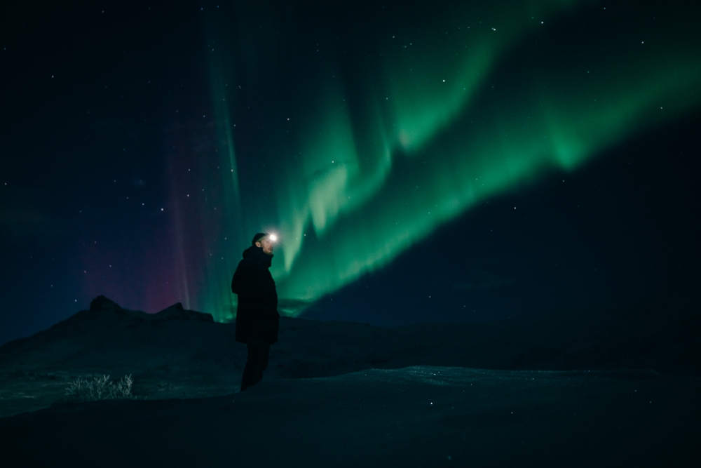 這張照片是體能與耐力的極限測試。去年 Ni 在北極圈內工作,那是永夜的國度,每天只有三小時的微光,和時間奔跑。到了夜晚,拍攝極光不僅要對抗刺骨的寒冷,還要在伸手不見五指的黑暗中操作相機。