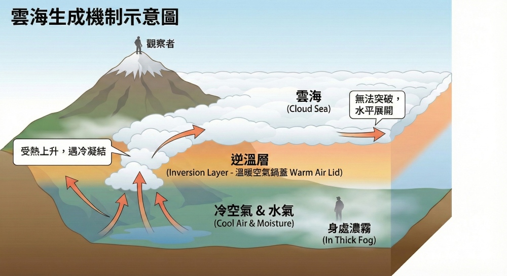 雲海本質上就是雲,只是觀察者的位置比雲更高,所以看下去像海。它的形成需要兩個基本條件:充足的水氣與穩定的逆溫層。