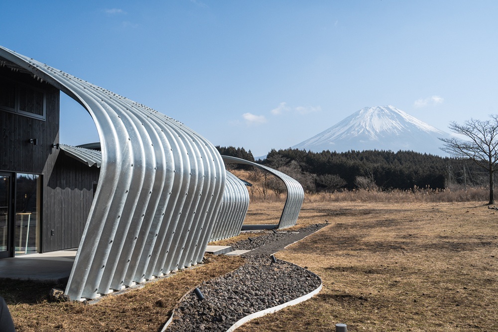 Cafe SHIZEN 不僅是一間餐廳,更是一座與葡萄酒釀造所併設的複合空間。建築由知名建築師遠藤秀平操刀,外觀擁有極具張力的獨體曲線。最特別的是,其主體採用了名為「Corrugated(コルゲート)」的波浪型薄鋼板,這種建材具備極輕量、高強度且耐蝕性極佳的特性,未來甚至連富士山上的避難小屋也會採用同款材質。這份對環境友善、易於運搬與組裝的建築邏輯,正與戶外職人的精神不謀而合。