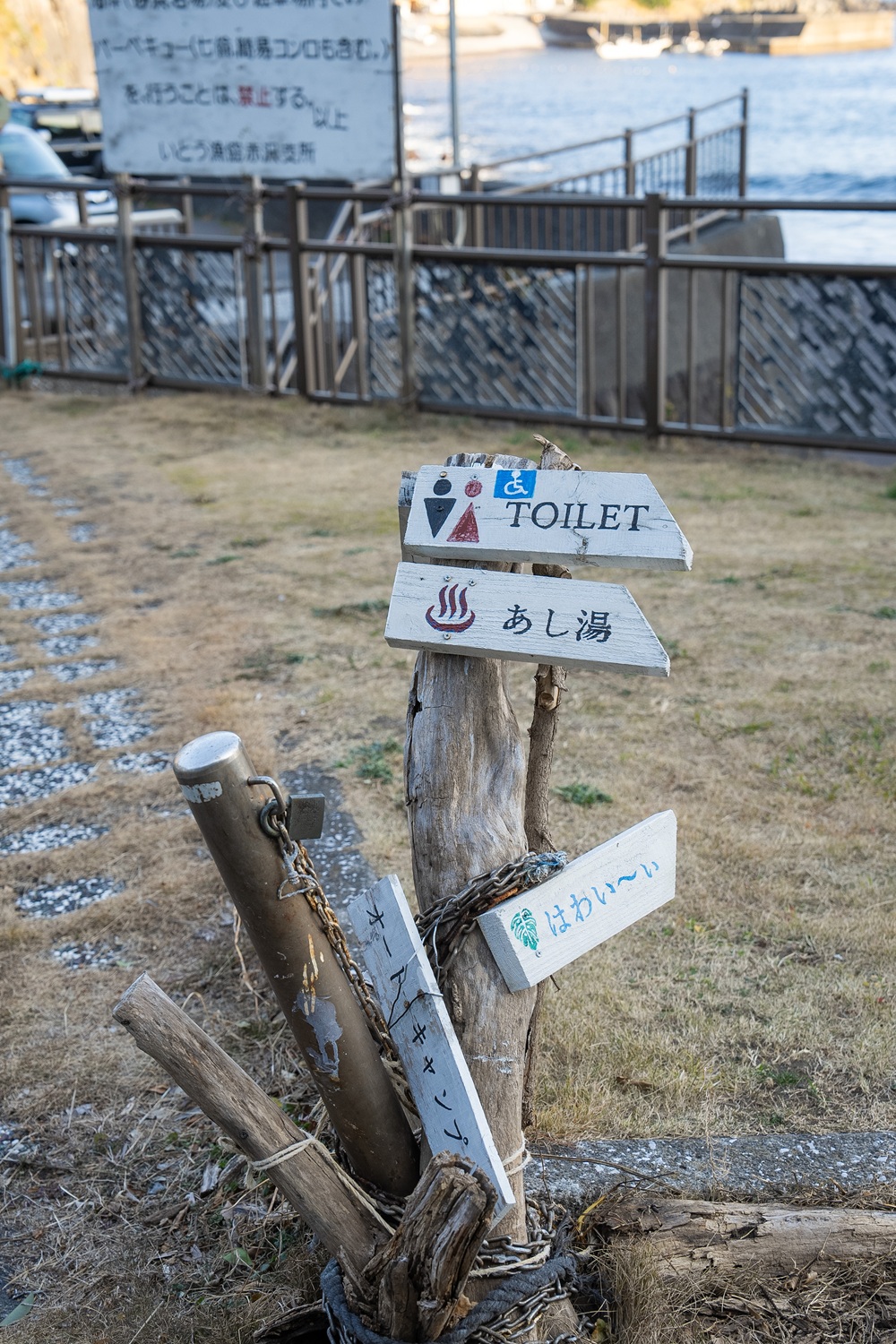 這裡藏著一個只有內行人才知道的 Umino Camping Ground 野營地,但腹地不大,感覺更適合機車露營者的場地。此處還設有一個免費的天然足湯,一邊感受地下湧出的暖意,一邊眺望赤澤灣。對於長途自駕的旅人來說,是可以隨興就能享受到的「海景足湯」。