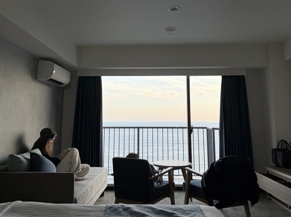 在熱川溫泉一帶,編輯私心推薦入住 Atagawa Ocean Resort(熱川海洋度假村)。特別喜歡這裡營造出的不疾不徐的度假節奏,一踏進房間,映入眼簾的是海景第一排的景觀,全館都是 39 平方公尺起跳的大空間,這在伊豆一帶非常難得,我們入住雙人房,兩個大行李箱攤平也完全不影響走動。