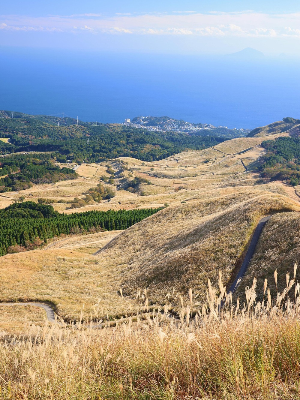 從山頂的角度可以一覽相模灣和伊豆群島的山海交融壯麗全景。身後可以欣賞到伊豆西部山脈的 360 度全景,包括萬座三郎山(海拔1406 米)和萬次郎山(海拔1299 米)的山峰,它們是天城山的最高峰,因健行活動盛行而廣受歡迎。