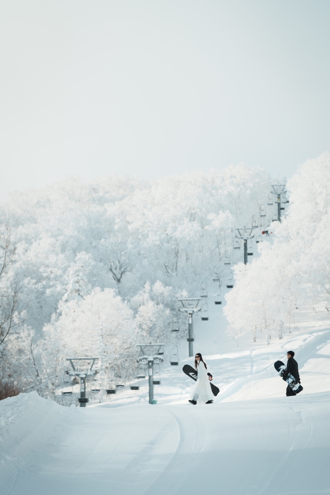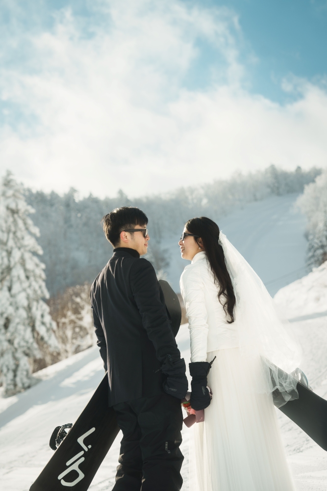 談起第一次在雪場拍攝婚紗照的經驗,栩栩至今仍印象深刻。在雪場拍婚紗在台灣相對少見,為此他事前做足了功課,參考了不少國外攝影師作品,也與新人做足溝通,了解他們的喜好風格、希望呈現的氛圍。拍攝當天,身穿婚紗的客戶在雪場引起了不小的騷動,「我想應該沒有多少人會在雪場看到有人穿婚紗吧,哈哈哈哈。」栩栩笑說。