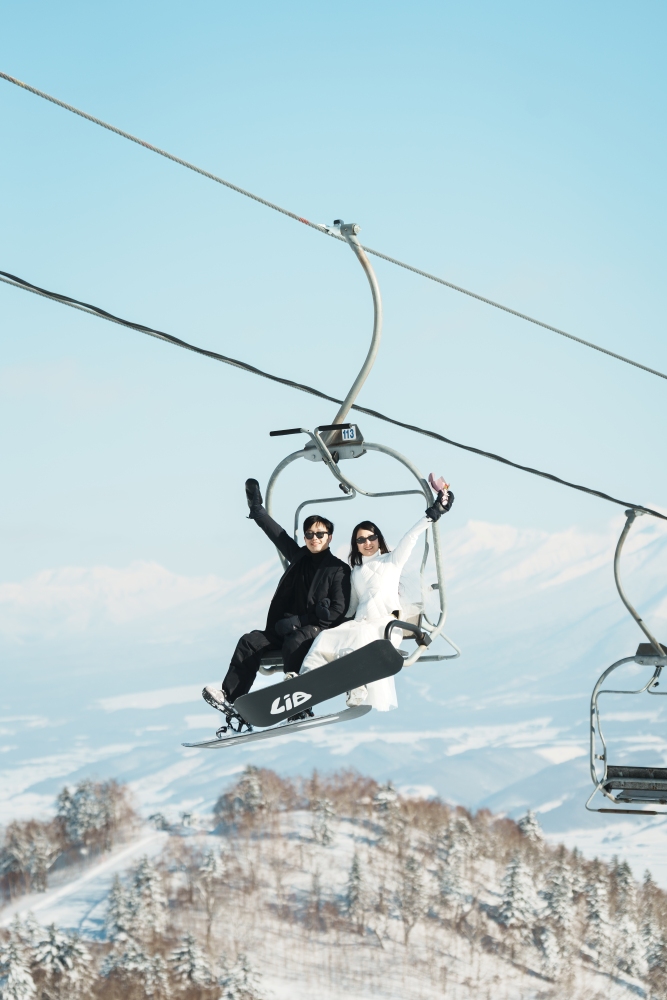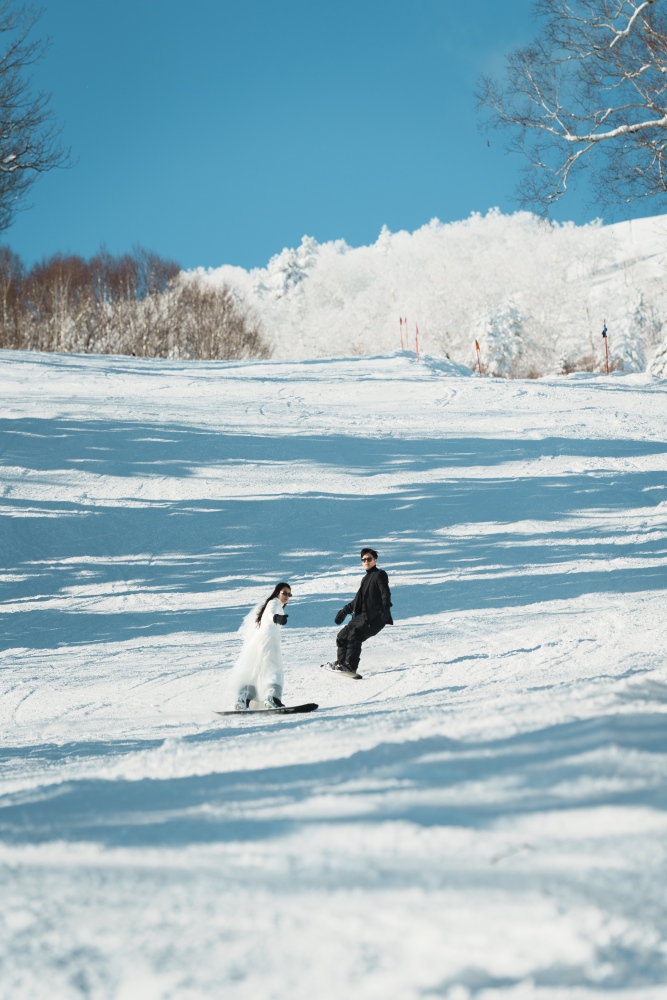 這場歷時三小時的拍攝,節奏並不如傳統婚紗那般緊繃,反而像是大家一起開心滑雪的抓拍紀錄,力求捕捉最自然的瞬間。栩栩分享,幸好當天出了太陽不至於太冷,新娘在婚紗內穿著保暖衣物,臉上帶著清淡的妝容並配戴雪鏡,在滑行時任憑頭髮隨風飄逸,展現出獨特的雪地浪漫。