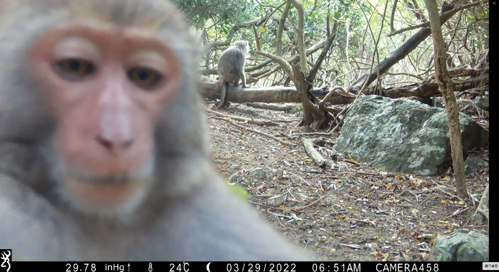 原來,是一隻調皮的臺灣獼猴對這個陌生的機器產生了好奇,直接把照相機抱走把玩了一番。