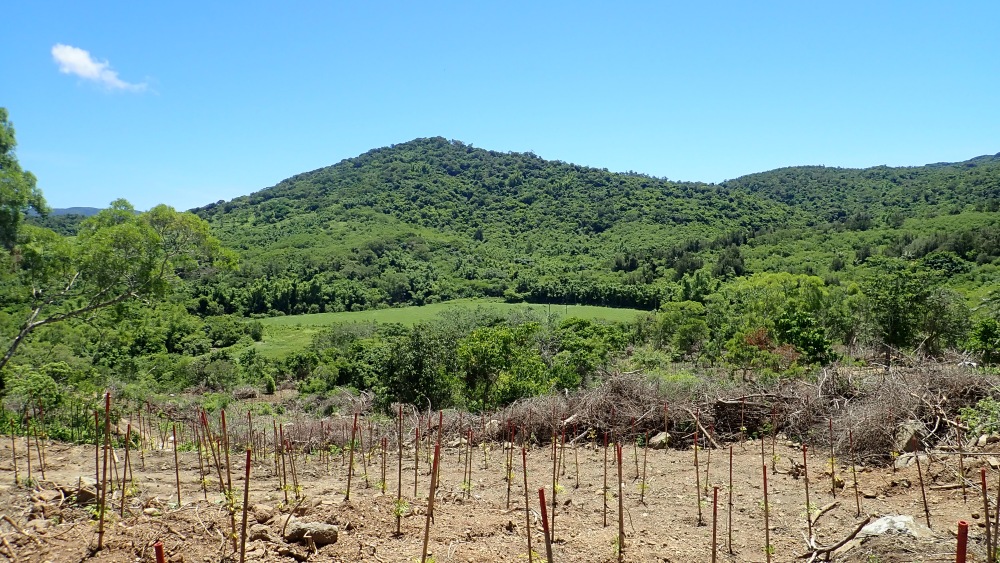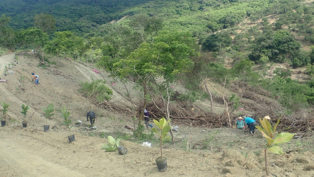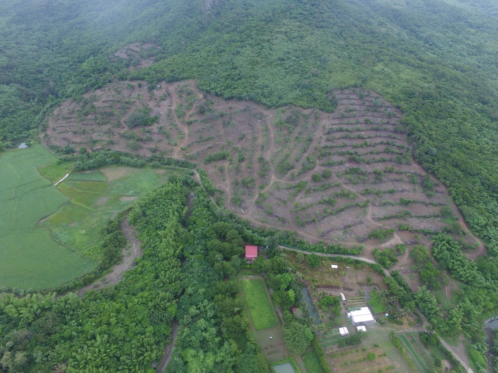 然而,看似暴力的整地其實充滿了對土地的溫柔考量。「整地不是完全整掉,也有留大樹,讓它天然下種,也要鞏固土質。」何芫薇細細解釋著其中的工法。除了顧及水土,她們更像是在為山林作畫:「我們有詳細規劃種法,高大的喬木選擇冬天葉子變紅色的烏桕、春天會開黃花的相思樹,低矮的灌木選擇清香的月橘、恆春半島特有的台灣樹蘭來點綴。」試圖為未來的山林描繪出豐富的層次與色彩。