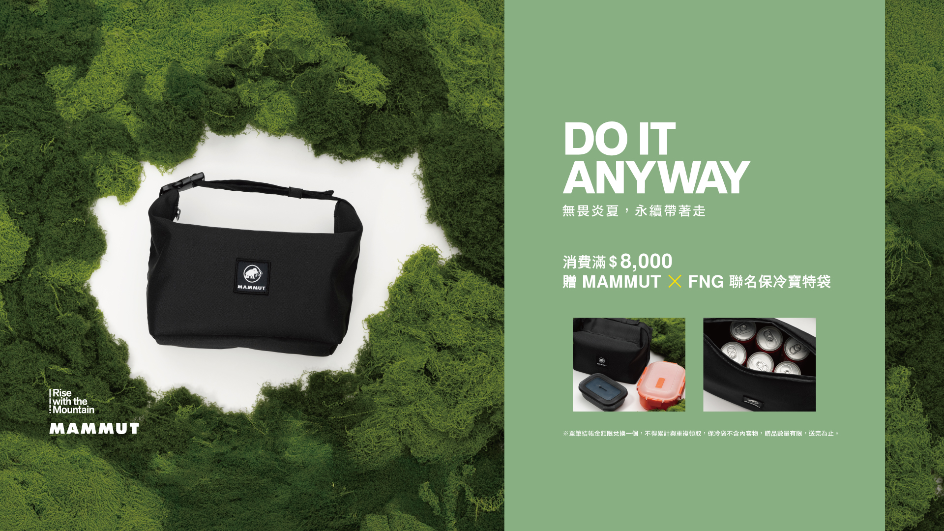 為慶祝新門市開幕,MAMMUT 推出限定開幕回饋活動。活動期間單筆消費滿 8,000 元,即可獲得 MAMMUT x FNG 聯名保冷寶特袋乙份,並加碼贈送「限量小象娃娃 & 娃包組」,全店限量 30 組,具收藏價值,贈完為止。