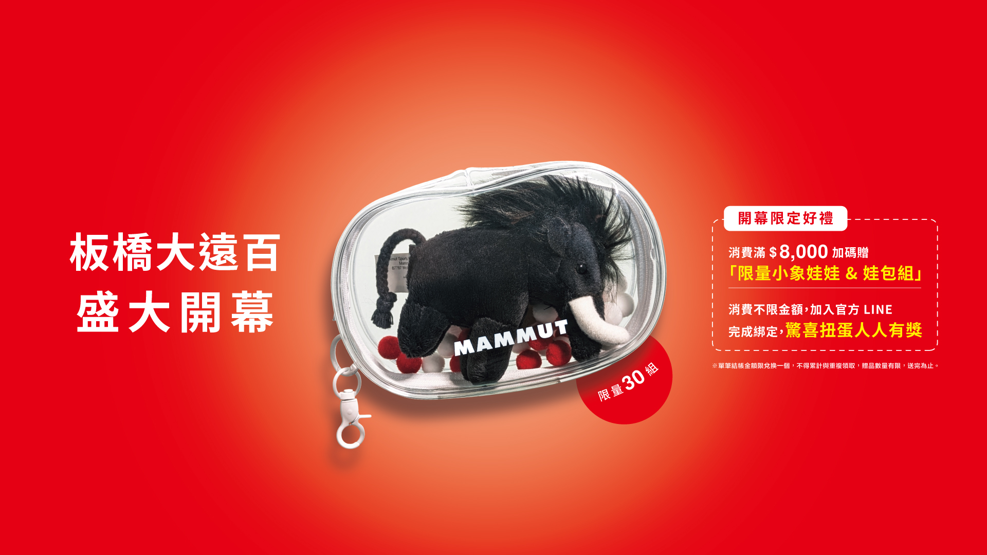 瑞士戶外專業品牌 MAMMUT 長毛象,於母親節檔期之際,拓展新北市據點,於 2026 年 4 月 17 日正式進駐板橋大遠百。開幕期間 4 月 17 日起推出限定「限量小象娃娃 & 娃包組」與「人人有獎扭蛋機」等加碼活動!邀請大小朋友一同走進門市,開啟屬於自己的探索時刻!