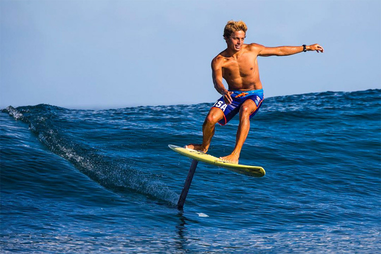 Kai Lenny 將高速帆船、競賽風帆,甚至短板衝浪板底部加上一根倒 T 字形的「水翼( hydrofoil )」,並成功以這樣的模組在水面上衝出幾乎達時速 32 公里,而且不需要用槳也能維持速度前進。