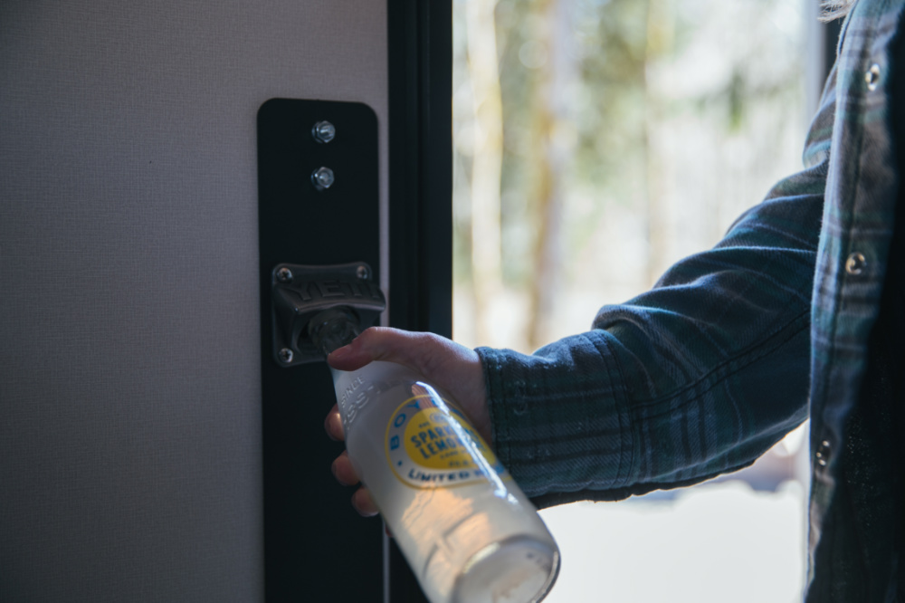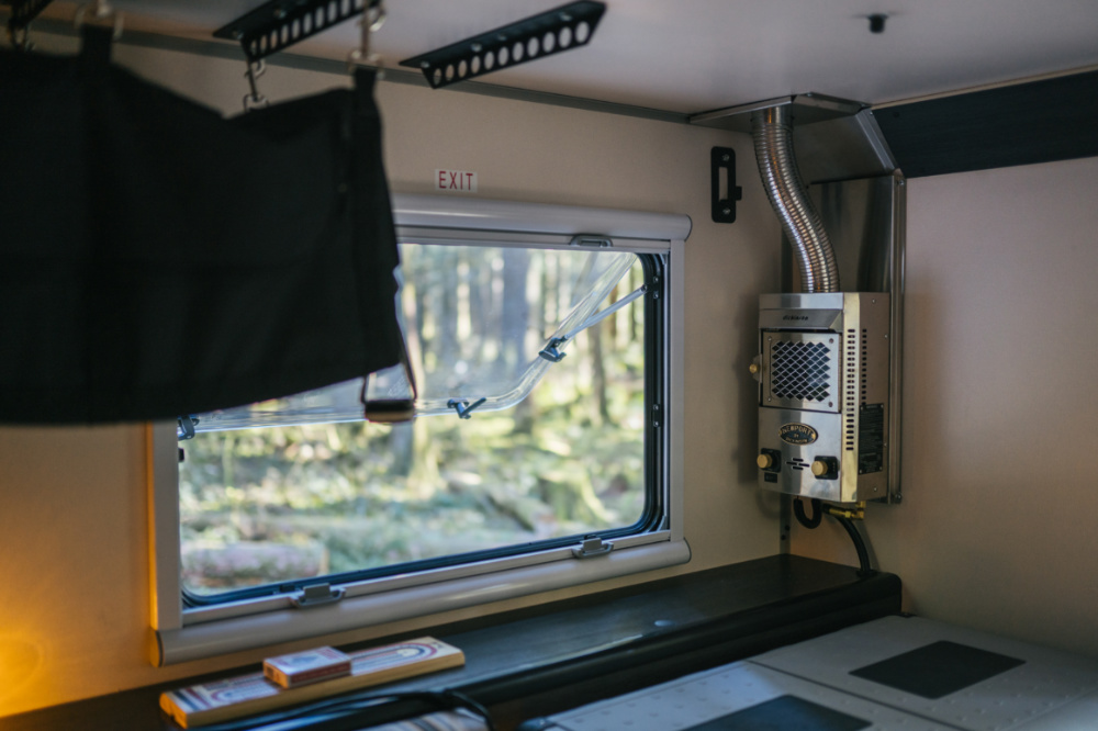 細看車廂頂部,會發現 Olympic 有一片太陽能板,沒錯,這個露營車廂配有 160W 的太陽能發電設備,可提供車廂內車燈、點菸器、接充電使用。Olympic 還配有 Goal Zero 出產的 Yeti 1000 行動鋰電池充電站,搭載雙 110V 插座、USB 接孔。安全設備也沒少,Olympic 配有滅火器、煙霧偵測器。