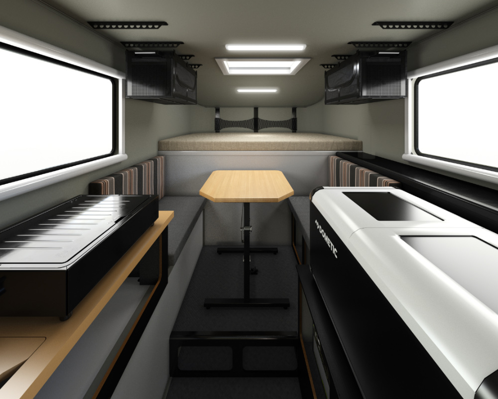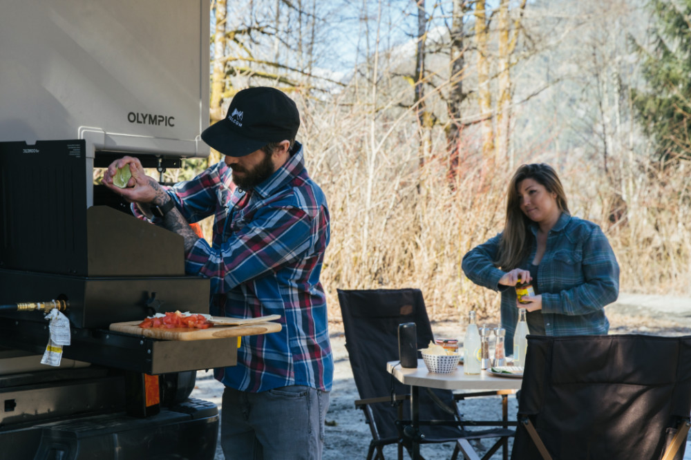 Olympic 主打輕量型設計,且部分配備可以移到戶外使用,像是四人室內用餐桌就可以拆卸挪到戶外當作室外餐桌、工作桌,另外還有選配設施也可以室內室外使用,像是行動爐具(Dometic 2 Burner Coockstove)、75L 冷藏/冷凍櫃,都可以自由的移動到戶外使用,大大增加活動範圍。儲水設備可容納 4.8 加侖的水,配有活性碳過濾功能,共可過濾 10,000 加侖的水。