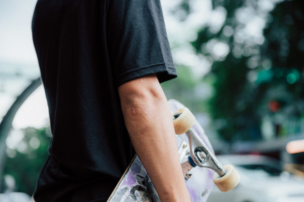 家元坐著跟我們分享他穿著 Smartwool 羊毛襪、Merino 塗鴉 Tee 練板的心得時,我們瞥見了他膝蓋上的好幾個傷疤,「這個喔,就受過一點傷啦,哪個玩滑板的不會受傷」,雖然他笑笑的輕描淡寫帶過,但在我們深入詢問後才知道,家元曾受過相當重的傷,脛骨碎裂、韌帶斷裂他都遭遇過,甚至長達一個多月無法站上滑板。