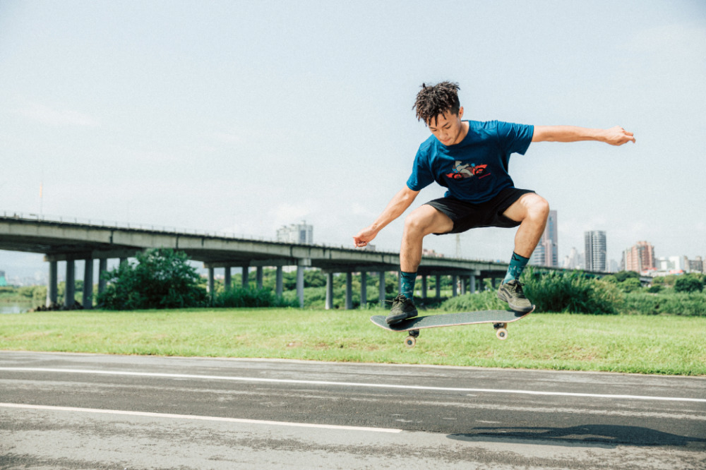 從小就崇尚美式街頭風格,最近甚至大膽嘗試「雷鬼頭」髮型,但練板時,比起造型好看與否,機能性對家元來說絕對是不可忽視的重點,「像我們滑板要穿板鞋,為的就是讓腳盡可能貼合滑板,所以襪子也會挑厚一點的,這樣腳才不會移位造成危險,試穿了 Smartwool 的 PhD 戶外輕量減震襪,我覺得這個厚度很剛好,跳躍降落陸地時腳也比較舒服。」