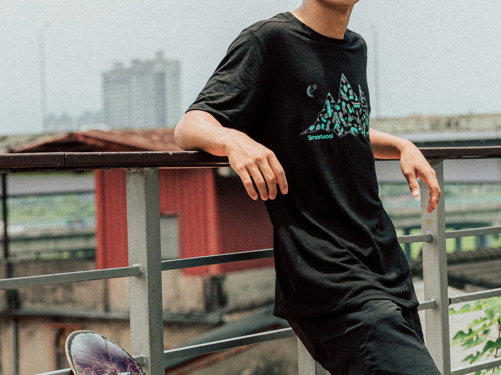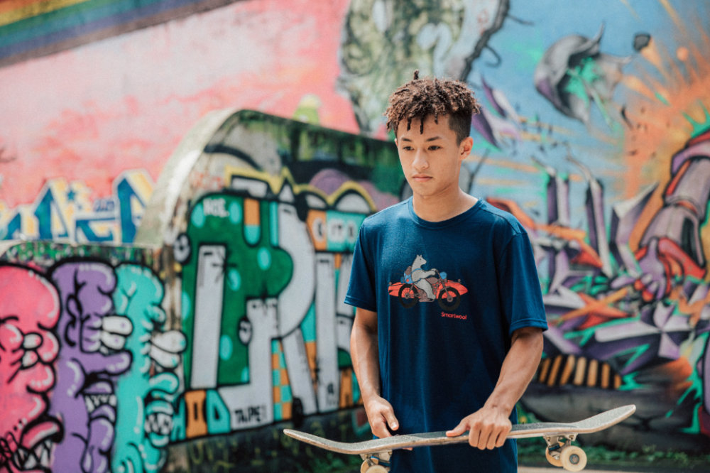 第一次穿上 Merino Sport 150 塗鴉 Tee,家元十分驚訝於羊毛用來作為夏天 T-shirt 的布料,「我以前一直以為羊毛只會出現在冬天的衣服」,拍攝當天,他穿著塗鴉 Tee 練板,儘管天氣炎熱,衣服上也出現大片汗漬,但到樹蔭下稍作休息後,衣服已經乾了一大半,襪子也沒有發出異味,讓他對美麗諾羊毛的控溫、快乾與抑臭特色大開眼界,且可愛的設計也讓他很想穿上往戶外跑。