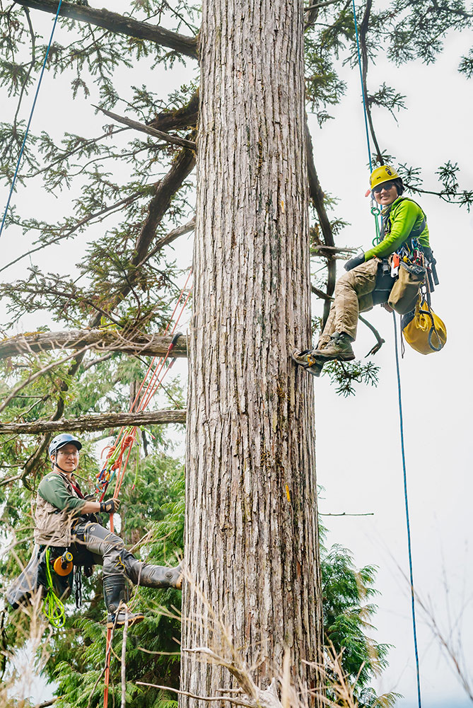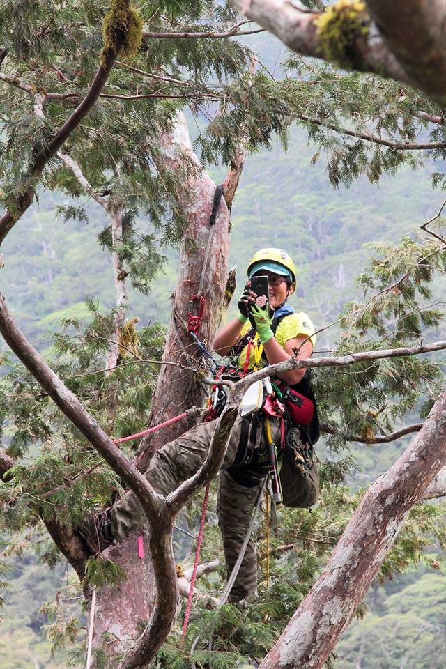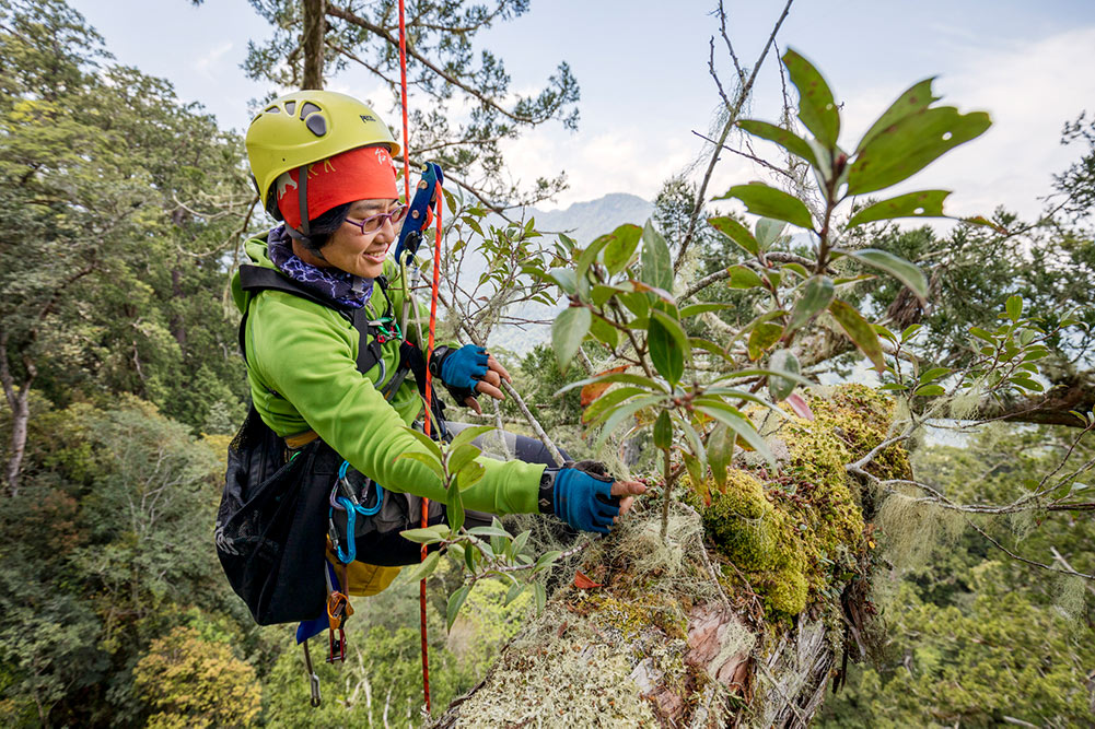從樹根上攀到樹頂,要花多少時間?徐嘉君給了一個出乎意料的時間:10 來分鐘。她說攀樹一旦熟練了,過程都很快,但是她因為需要研究樹冠層,往往在樹上一待就是六、七個小時,她會對每一根枝條測量方向、角度,查看有什麼附生植物,她說這是她攀樹的意義所在,也是最心曠神怡的時刻。