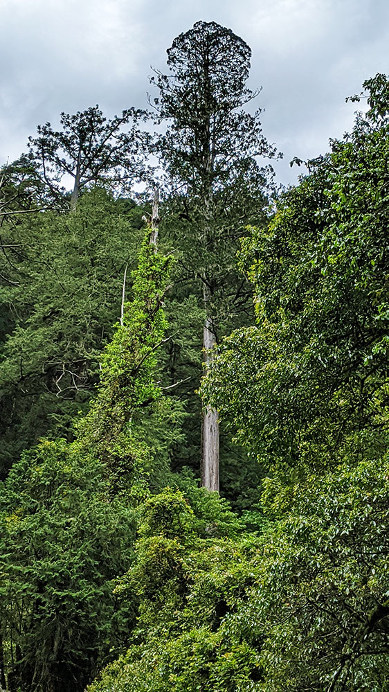 站在棲蘭三姊妹底下,徐嘉君一行人原本以為這是一棵胖胖的樹,因為最粗壯的一棵根部直徑有 3 公尺長,但看到等身照片出爐後,才知道原本以為胖胖的樹竟然如此修長,帶給她莫大的震撼。