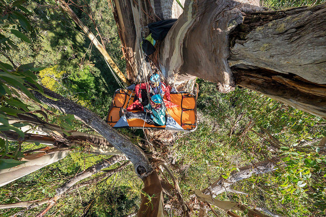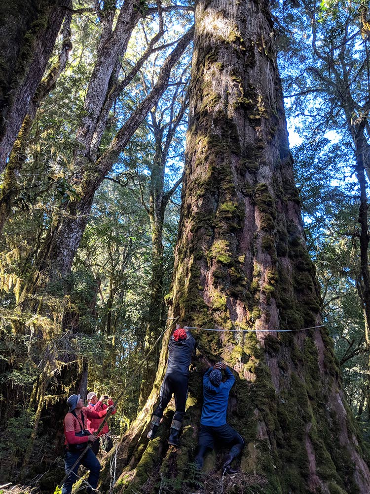 徐嘉君解說,要攀上高樹之前,得先固定繩子,美國大多採用十字弓,將釣魚線射上掛點,然後再架設繩子;台灣則大多以空氣槍方式進行。徐嘉君說上攀無需太高深的技術,但這是門體力活,所以如果想挑戰攀樹,平時的體力訓練少不得。以棲蘭三姊妹為例,徐嘉君一行人採取的作法是先將掛點設定在比較靠外面的樹(因為最高的大姊比較不易架設掛點),到樹上後,再以隨身短繩加上沙袋,拋向更高的掛點,慢慢往內橫渡。抵達最高那棵樹後,盡可能靠近頂端,然後拿竿子架皮尺從最頂端的枝條垂到底部進行高度測量,高度太高的話中間還會有一個人作為中繼站接住皮尺,聽來原始,但徐嘉君說這是最準確的方式。