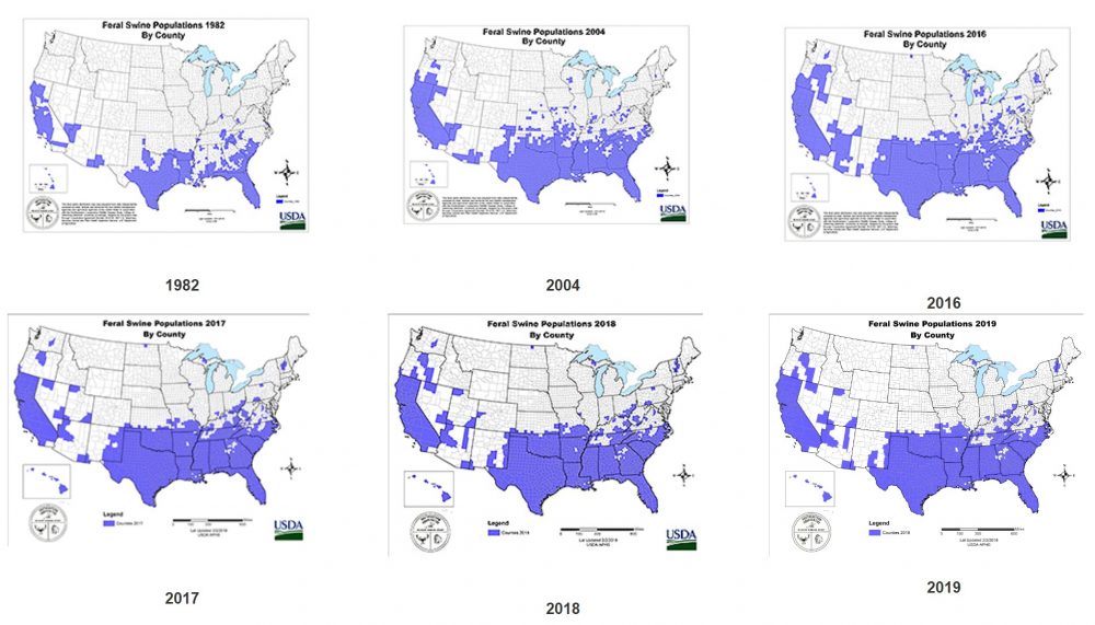 ▲不同年代的美國野豬分布圖。圖片擷取自 USDA