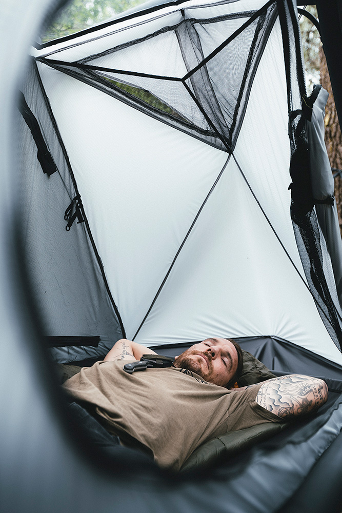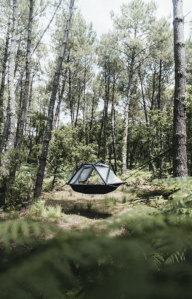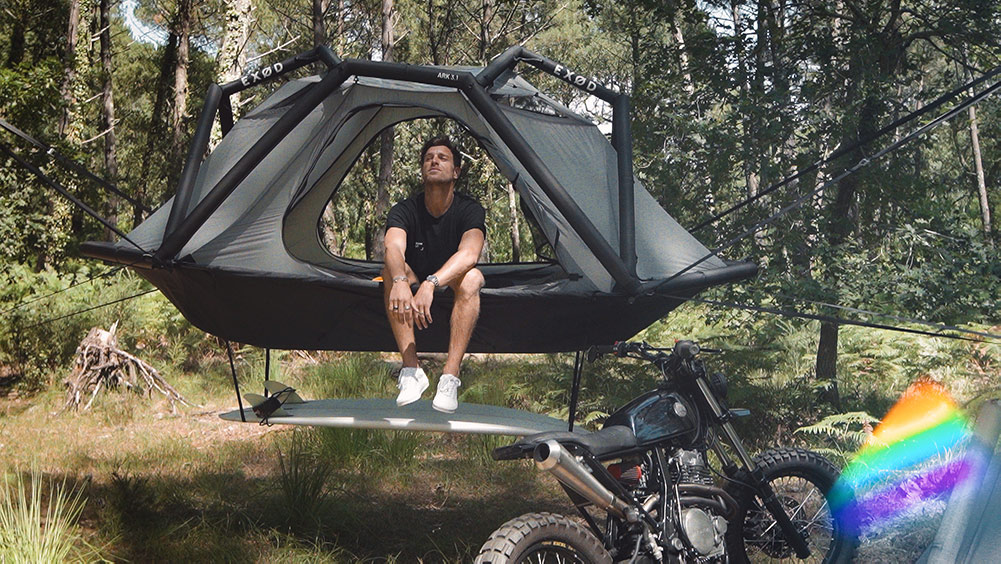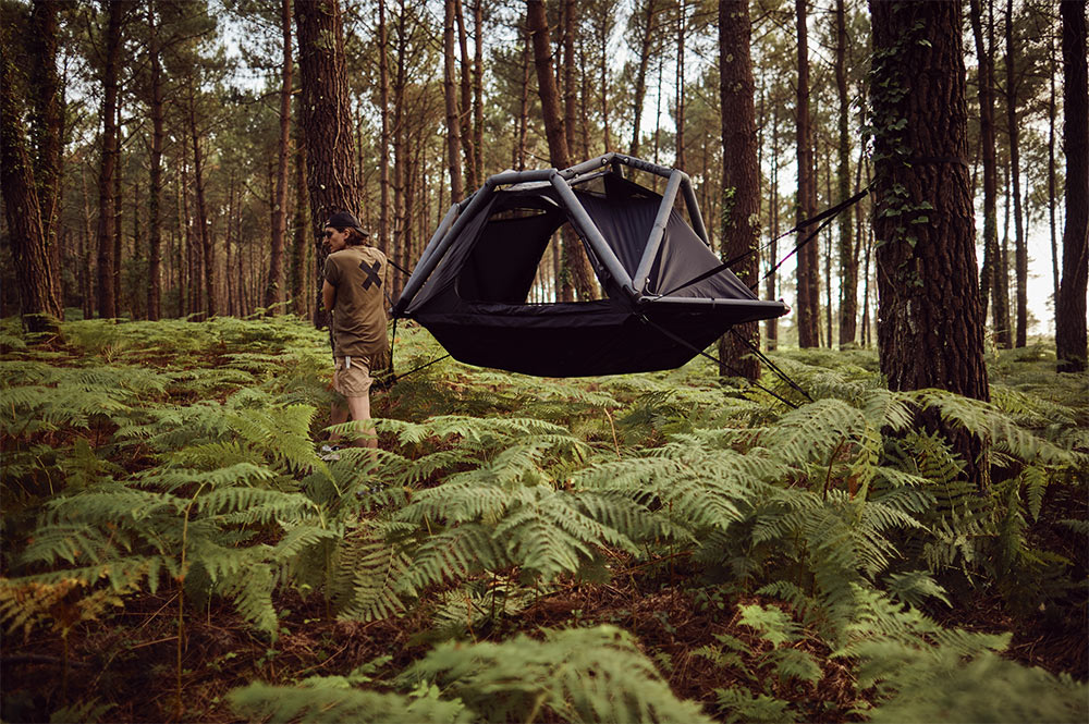 但這回要介紹給大家的不是 Heimplanet,是在募資平台 Kickstarter 大放異彩的 EXOD,同樣主打充氣帳篷,但其推出的 ARK 款式,不僅可架於平地上,還可依據不同地形懸吊,諸如樹林間、巨石間都可以,甚至要掛在橋下也行得通,可謂一款適應多地形變化的多功能帳篷。