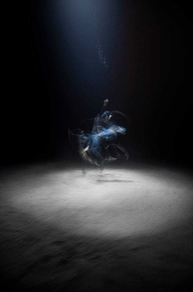 「我們三個人到達海邊後才發現,夜晚的綠島太美了,海裡有像是藍眼淚的生物,看起來就像是星星掉進了海裡,一閃一閃的。我說不如我們來拍照吧!阿崴先前是優人神鼓的團員,他說他來跳舞,我來拍照,於是我們請楷仁從海面上拿手電筒往下照,阿崴就在我面前開始跳舞。我跪在海底按著快門,我的心跳得好快,那畫面美到我不敢置信,我只想盡可能把那種感覺記錄下來。」