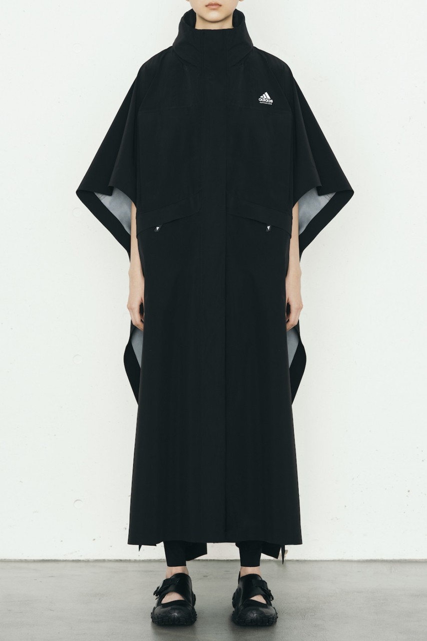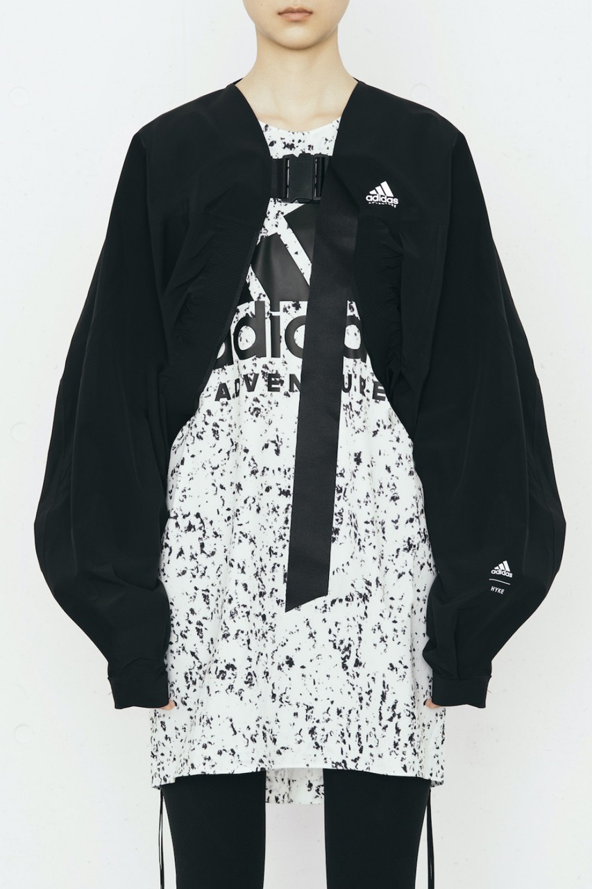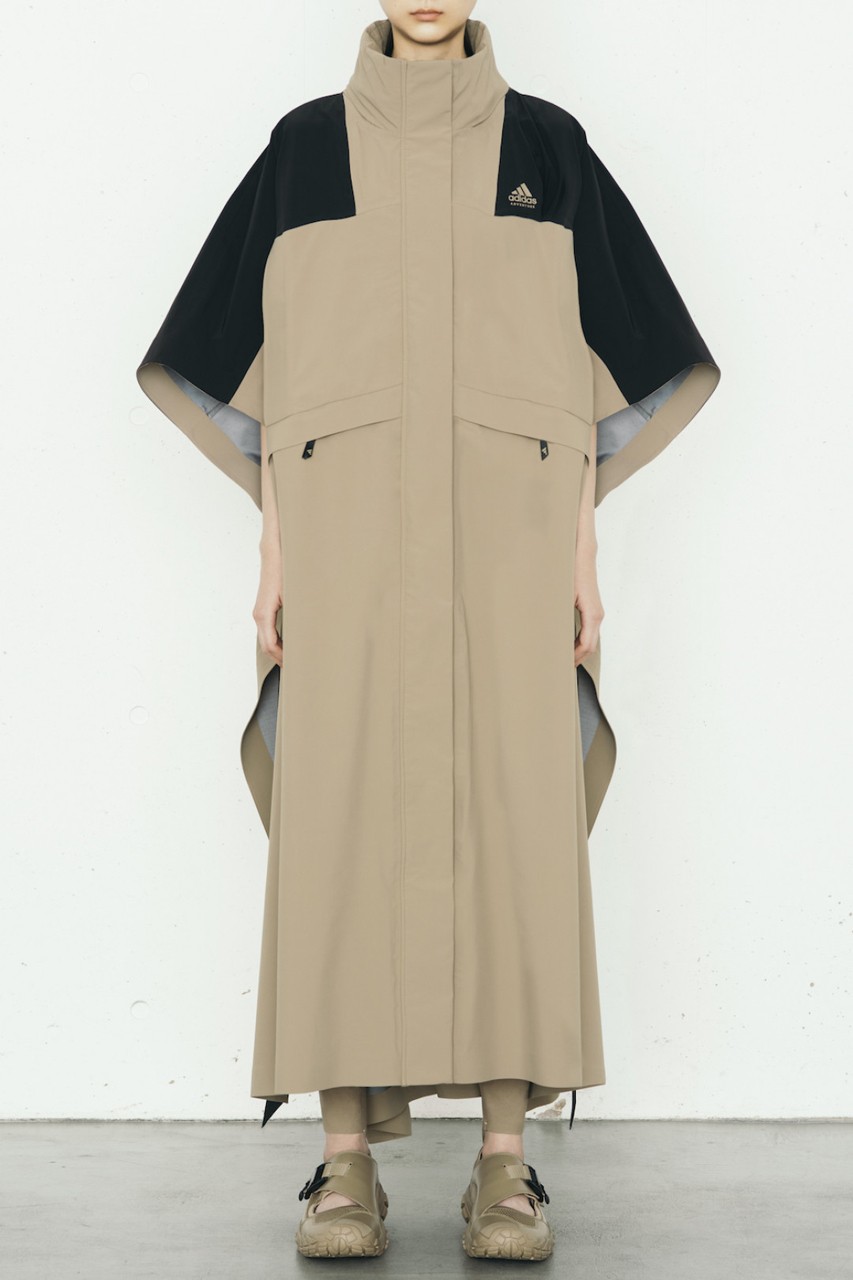 具有斗篷外型設計的長版外套靈感來自 90 年代 Adidas 的 Adventure Mountain parka,相較於傳統的 Mountain parka,經由 HYKE 的巧手後,長度蓋及鞋款的造型中更使用了皮帶及兩側帶長織帶,使外套能根據個人運動習慣做出不同調整,開衩剪裁以及胸前四個口袋這種一目了然的設計更代表 Adidas by HYKE 具備十足的機能性。