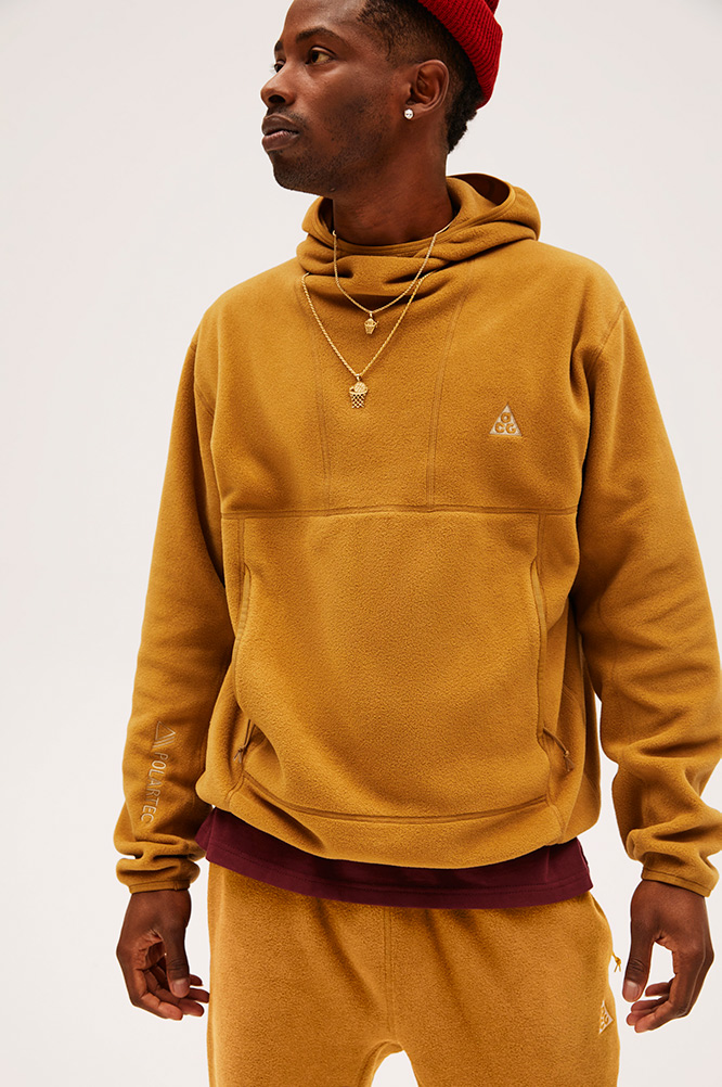 本次新作的一大亮點為多層次設計,可看出 NIKE 更以登山健行者的角度出發,從外層 Nike ACG Misery Ridge GORE-TEX 夾克看起,採用三層 GORE-TEX 防水技術,並以 100% 再生聚脂纖維織成,同時具有防風、防水、透氣等機能性;中層為 Nike ACG Rope De Dope 羽絨夾克,以火山地貌為靈感設計,除了可強化保暖防止熱能散失之外,也可壓縮收納;底層推出的是 Nike ACG Polartec Wolf Tree 連帽衫,採用 100% 再生羊毛製成。