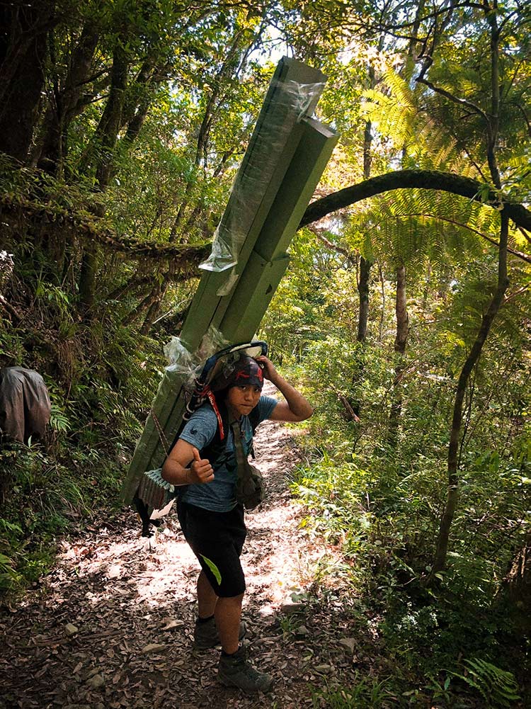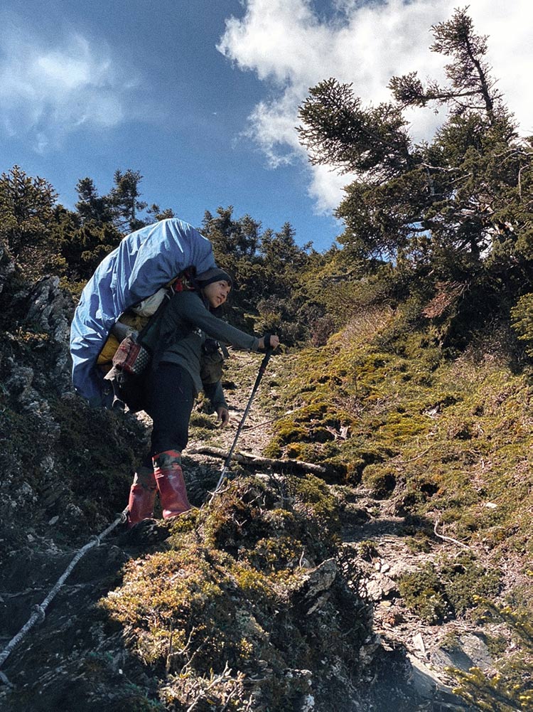 在通往嘉明湖的山徑上,你或許曾看過這麼一位女性協作,背負著 20 公斤起跳的食材與裝備,靈巧的跨過樹根、石塊,在九成九皆是男性的高山協作群體當中,來自布農族的巫瑪芙沒有因為身為女性就拒絕這份挑戰,她如同男性協作,背起將近體重 1/2 的裝備,走在跟其他人一樣的路上,靠自己的雙腳往上爬。