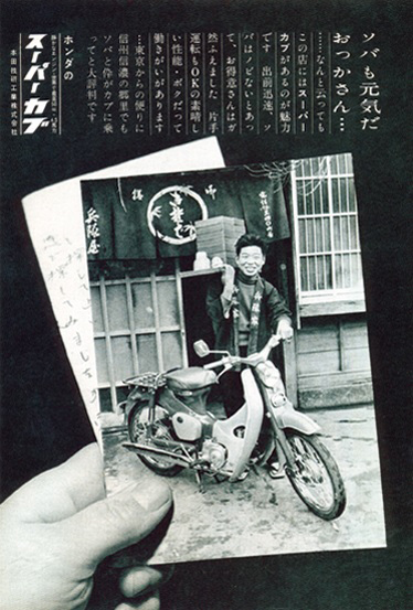 Super Cub 的第一彈廣告也有趣地延伸這樣的概念,在雜誌上刊登出『學習製作蕎麥麵的日子一切安好唷 母親』篇,廣告上的文案這樣寫道:「這家店最棒的就是擁有 Super Cub,外送起來非常快速,讓蕎麥麵不會糊爛,也讓點外送的常客們各個驚嘆連連,單手騎乘也 OK,除了讓人佩服,也讓我感到工作的價值和衝勁。」率性地勾勒出市井小民的生活,還帶點幽默詼諧的口吻,在當時深植人心。