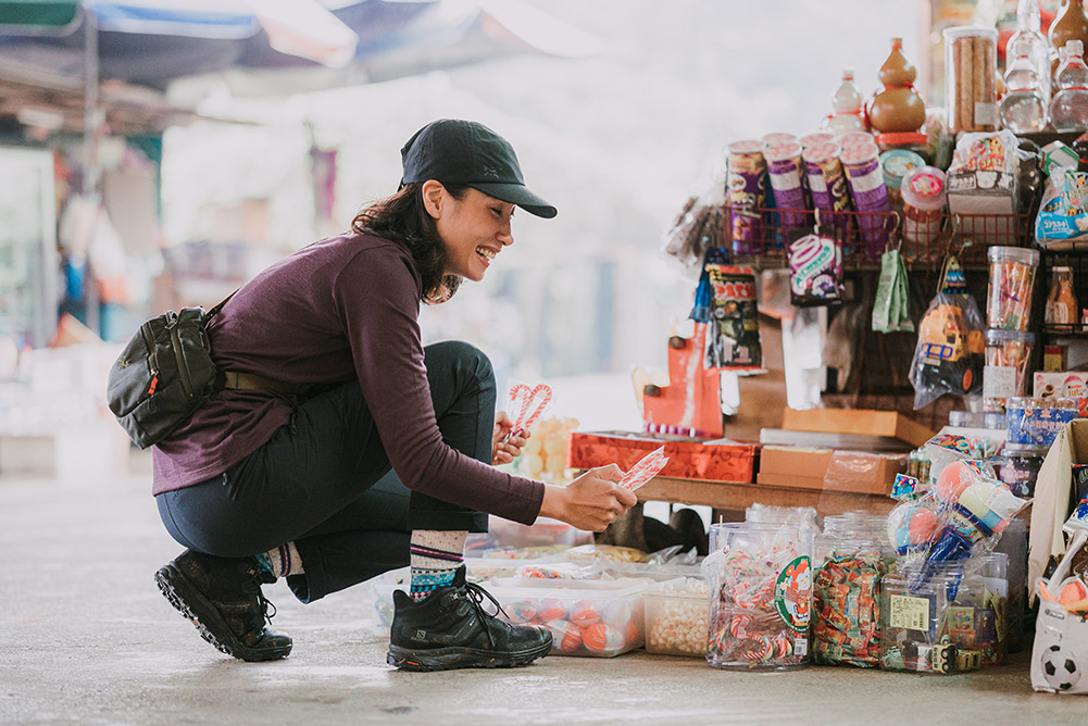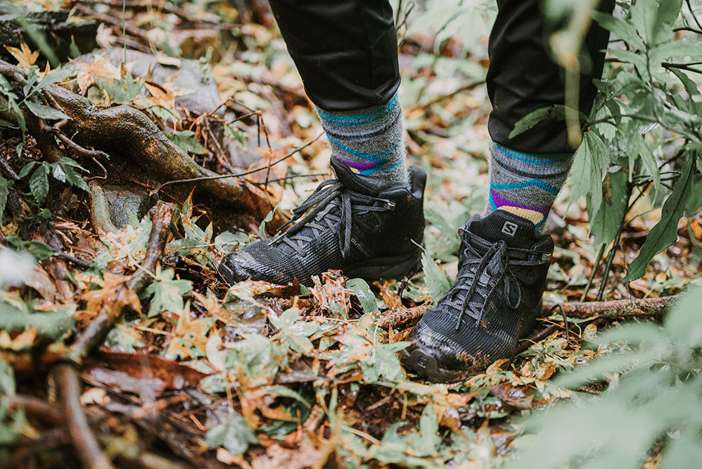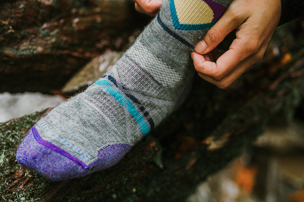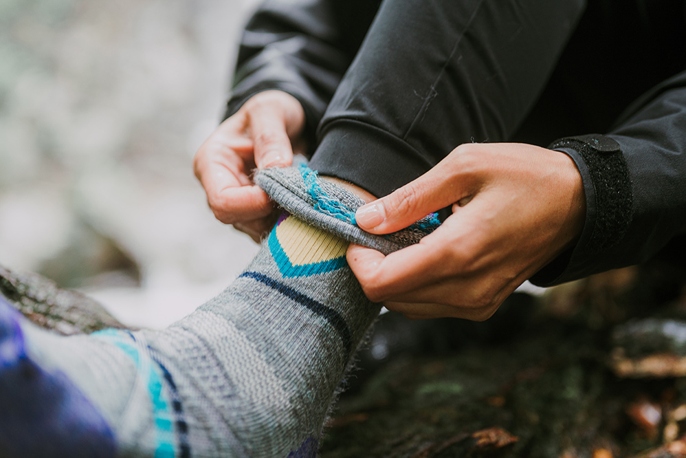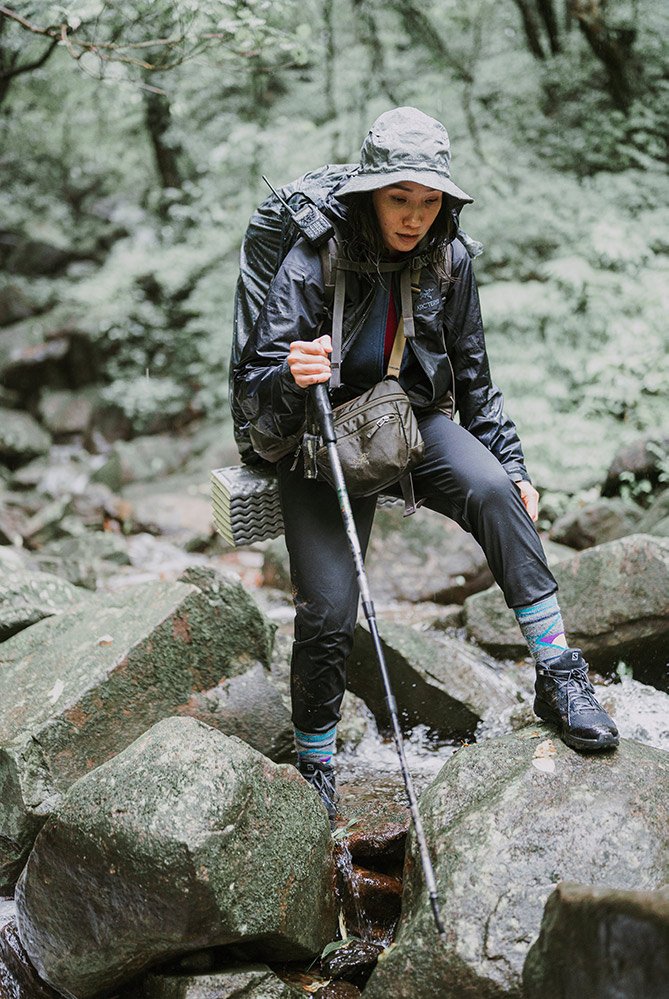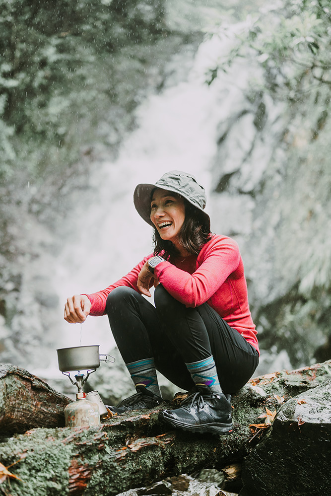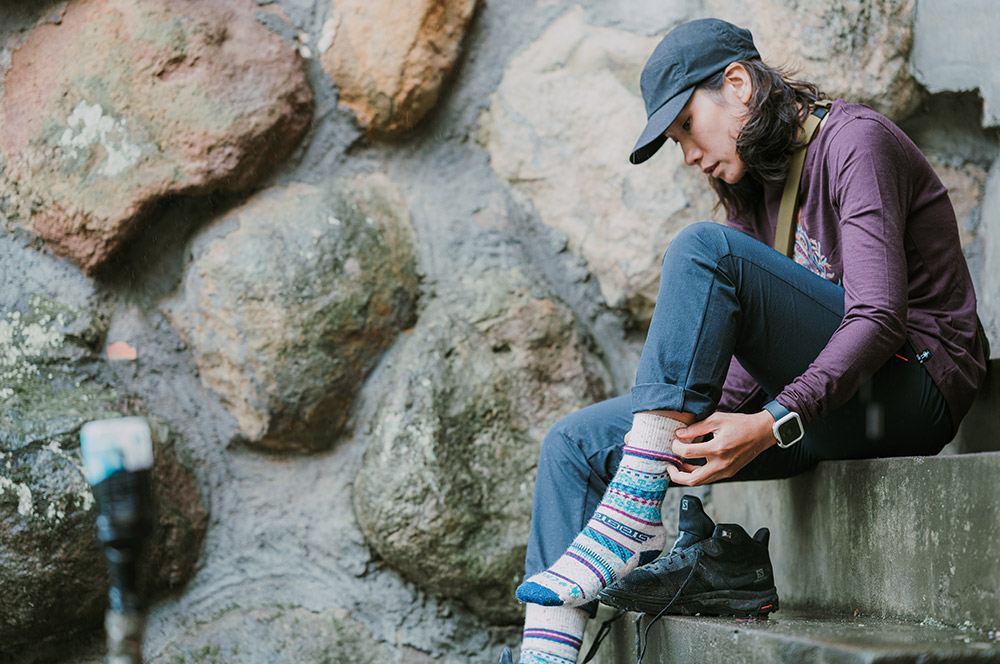 潘維她笑說自己很怕冷,所以一年四季爬山都會帶羽絨外套或是背心,此外就是必備的羊毛襪,「襪子雖然不比衣服來得重要,可是對我來說,四肢保暖很關鍵,所以我一定會穿羊毛襪,像我腳上這雙 Smartwool 的美麗諾 PhD 戶外中量級印花中長襪,採用細緻的美麗諾羊毛織成,非常舒服,而且它很合腳,因為有四向彈力伸縮合腳系統,行進間可以牢牢的貼合在腳上,不用擔心襪子滑動。」