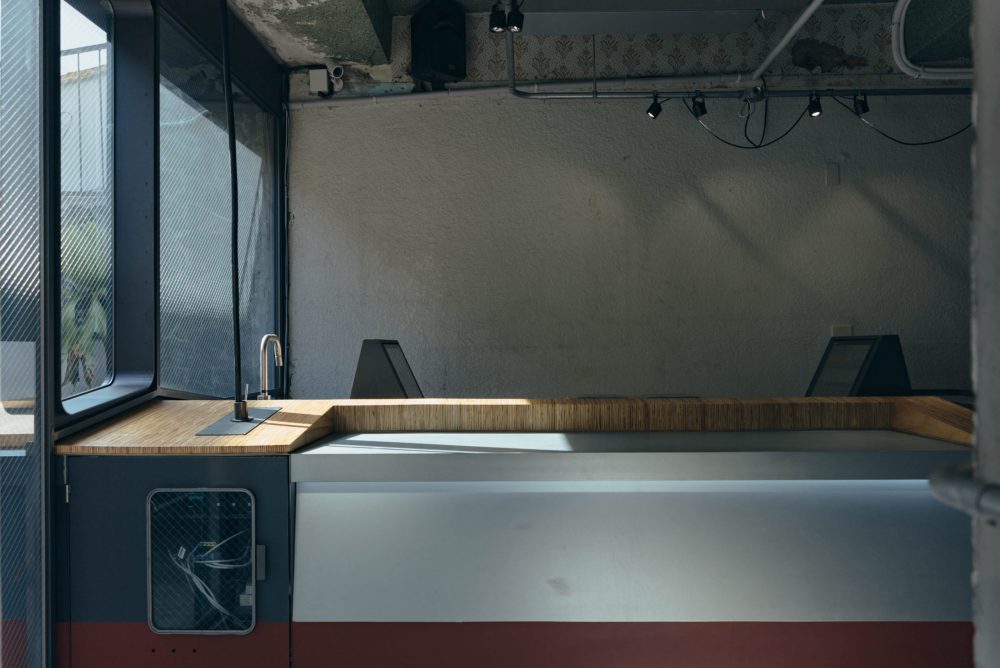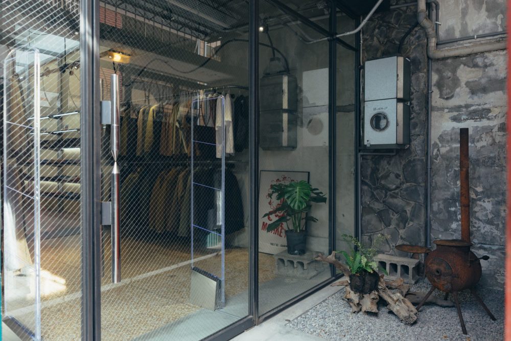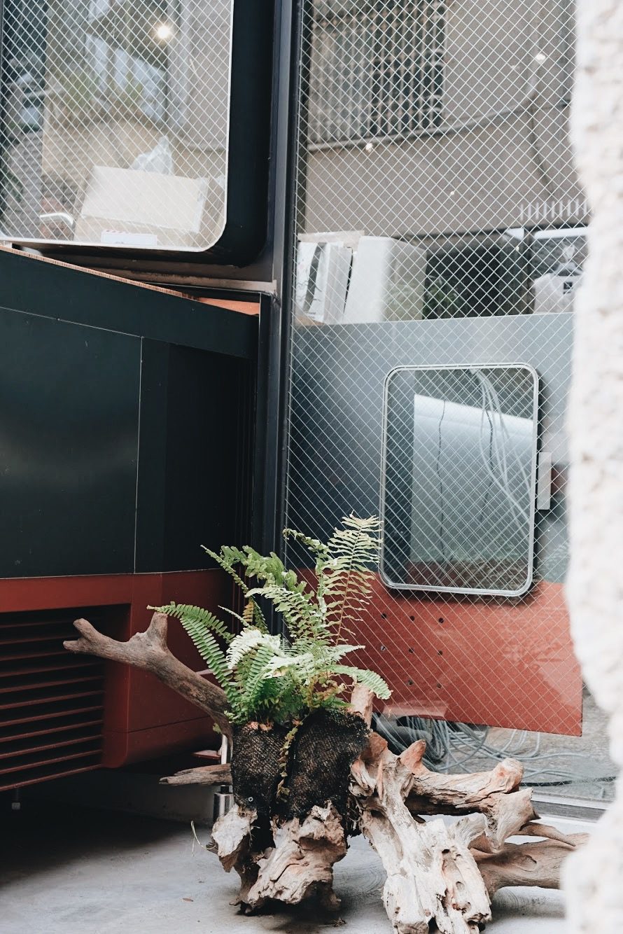 以此為創作概念下,台中店從裡到外的一切都圍繞這個主題去打造。仔細一看會發現許多老屋的痕跡還是清晰可見,牆壁斑剝的痕跡,老式的磁磚與格局幾乎都被完整的保留下來。而店內最顯眼的就是那艘像是列車的金屬物物架貫穿整的空間。SY 解釋這個空間其實是故意不去做太多的打磨修飾,就像是一艘象徵生命最後載體的方舟停進屋子裡,所有的生命發展、所有的管線都是以這台列車為生命中心向外延伸出去。