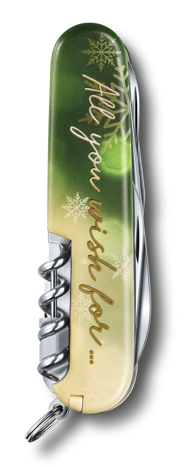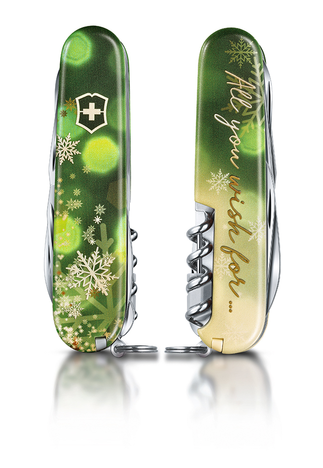 本次特別版 Climber 「All you wish for」瑞士軍刀,刀殼以金綠色雪花及節日語句「All you wish for」洋溢聖誕節日的氣息,配上高級精美的熨金禮盒,襯托出這款特別版軍刀的尊貴。全球限量只推出 10,000 把,為收藏家帶來別具一格的佳節獻禮。