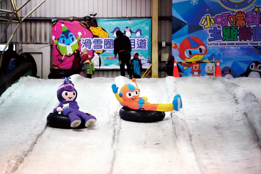 新竹的小叮噹科學園區內有個占地 750 坪,全台唯一的室內人造雪滑雪場。平均溫度 -3 至 -7 度,斜坡坡度約 14 度。場內可以租雪衣、雪褲、雪板等等滑雪裝備,建議剛接觸的朋友可以先租裝備當作試水溫,等玩出興趣後再陸續添購自己的裝備。不論是初學者還是已經有滑雪經驗,想要學習更多技巧的進階者,都有不同程度的教練課可以參加。比較資深的朋友除了可以來自主訓練外,也有夜間的包場練習可以選擇。雪道旁邊有親子戲雪區,與雪道隔開不怕互相干擾。不過很可惜的是目前雪場內還沒有設置輸送帶,每一次滑下來後還得搬著板子爬坡回去。基於每次都要爬坡,所以會比較建議來這裡玩單板,因為單板的雪靴比較軟,來回爬坡時的舒適度會比雙板的硬鞋來的好。