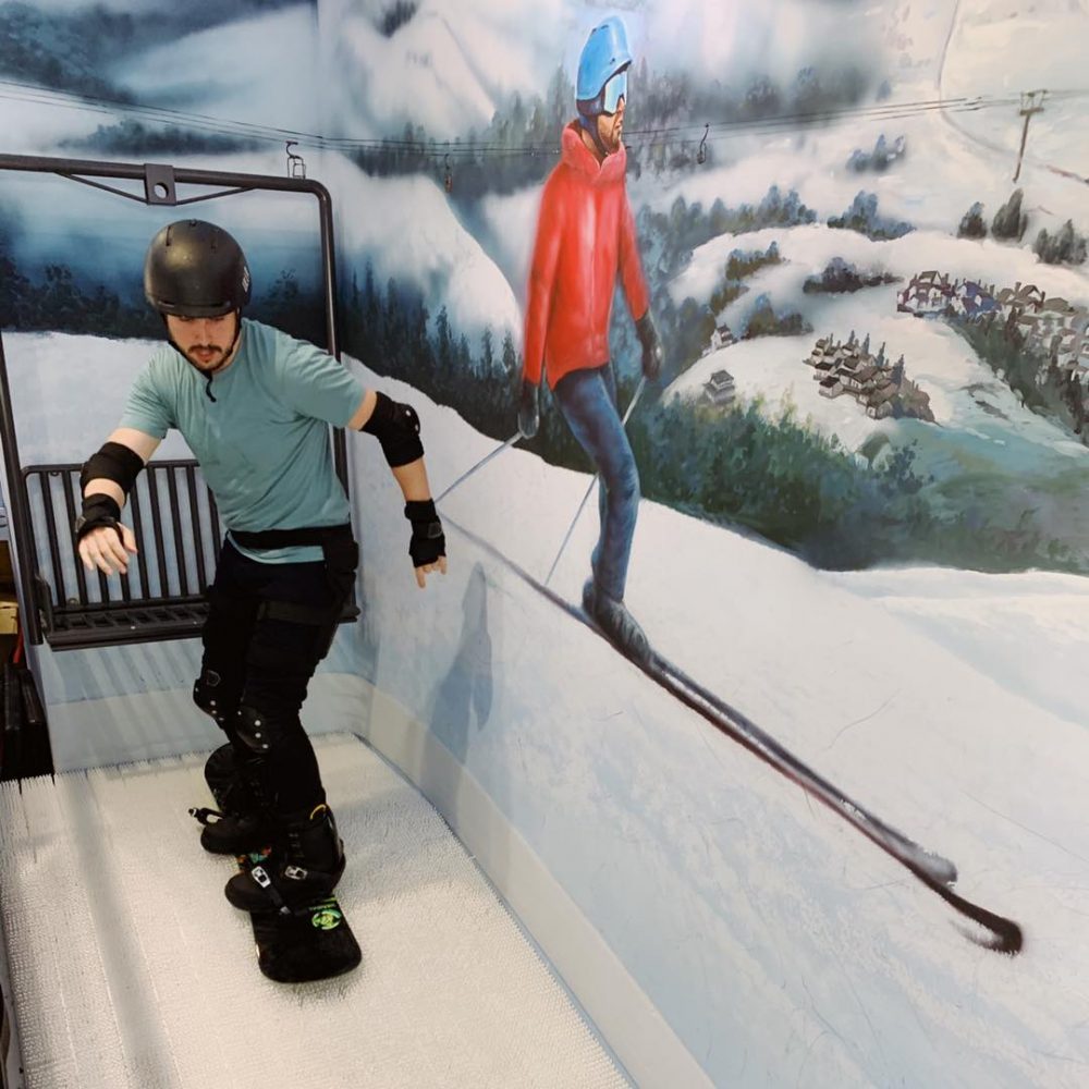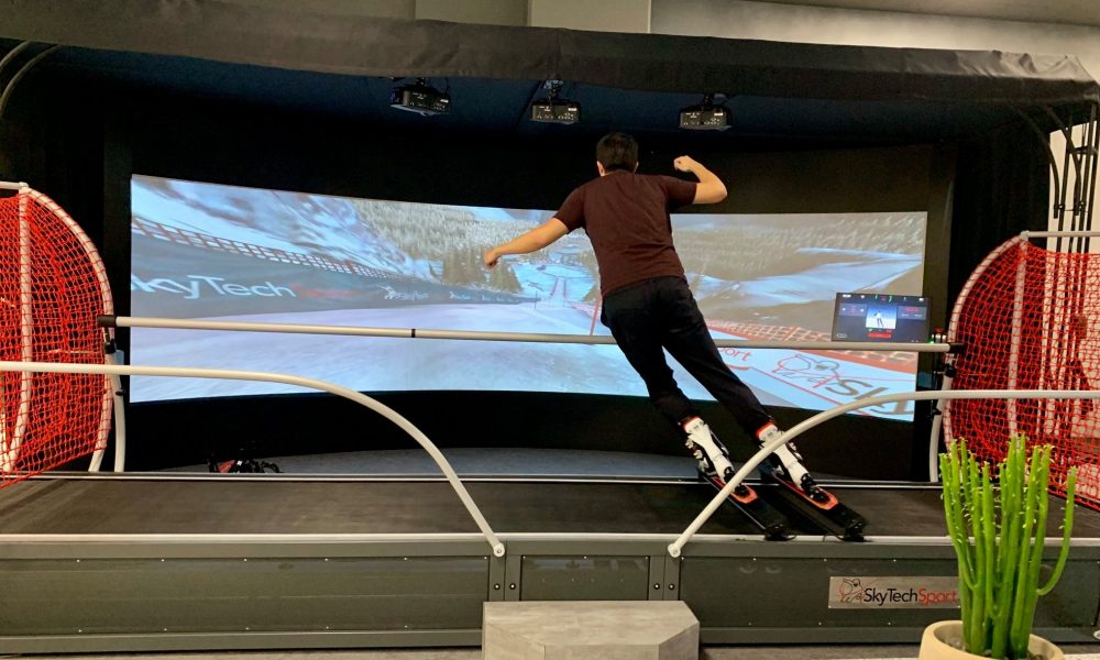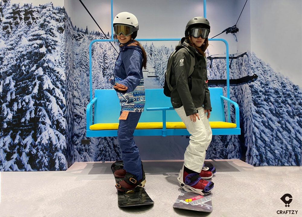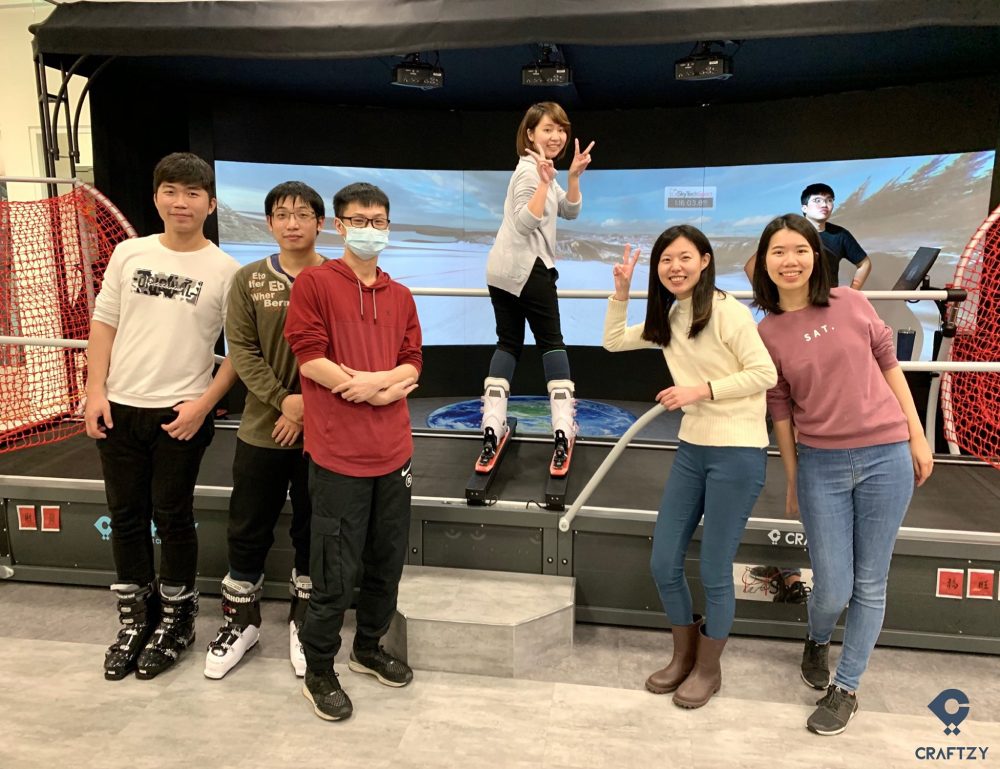 除了機械式滾動滑雪機以外,還有另一種滑雪模擬機可以選擇。同樣位於台北捷運西湖站附近的 Craftzy Sports Club 有著來自於美國加州,全台唯一的室內滑雪模擬器 SkyTechSports。第一人稱滑雪視角的 7.3 米曲面大螢幕,加上左右橫移的滑軌設計,在上面就感覺像是在玩大型遊樂機一樣。除了有一般的練習模式外,還有「曲道競速」 跟 「大曲道競速 」 模式。不論是單板還是雙板都能根據學員水平和進度客製化課程內容,甚至可以跟朋友、家人競技過旗門,參加排名賽,讓訓練就像玩遊戲一樣有趣。不論是毫無經驗的新手還是進階老手,都可以練習到真實滑雪時所需的肌耐力和體力。