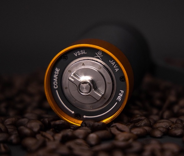 VSSL JAVA 以輕巧的鋁合金打造而成,而且還不是普通的鋁合金,是航太等級的鋁合金。上頭的掛鉤設計可以讓你掛在背包外,且不怕碰撞。此外,研磨器採用不鏽鋼材質,不僅可以有效率的顏磨咖啡豆,也不用擔心味道殘留。為了確保使用者可以在短短時間內就磨出細緻的咖啡粉,研發團隊也特別在手把上下了功夫,手把可以根據使用習慣伸長或縮短,而且握把還有針對人體工學設計,所以可以在一分鐘內將咖啡豆磨好。而研磨的細緻度更可自己設定,共有 30 段的設定可選擇。