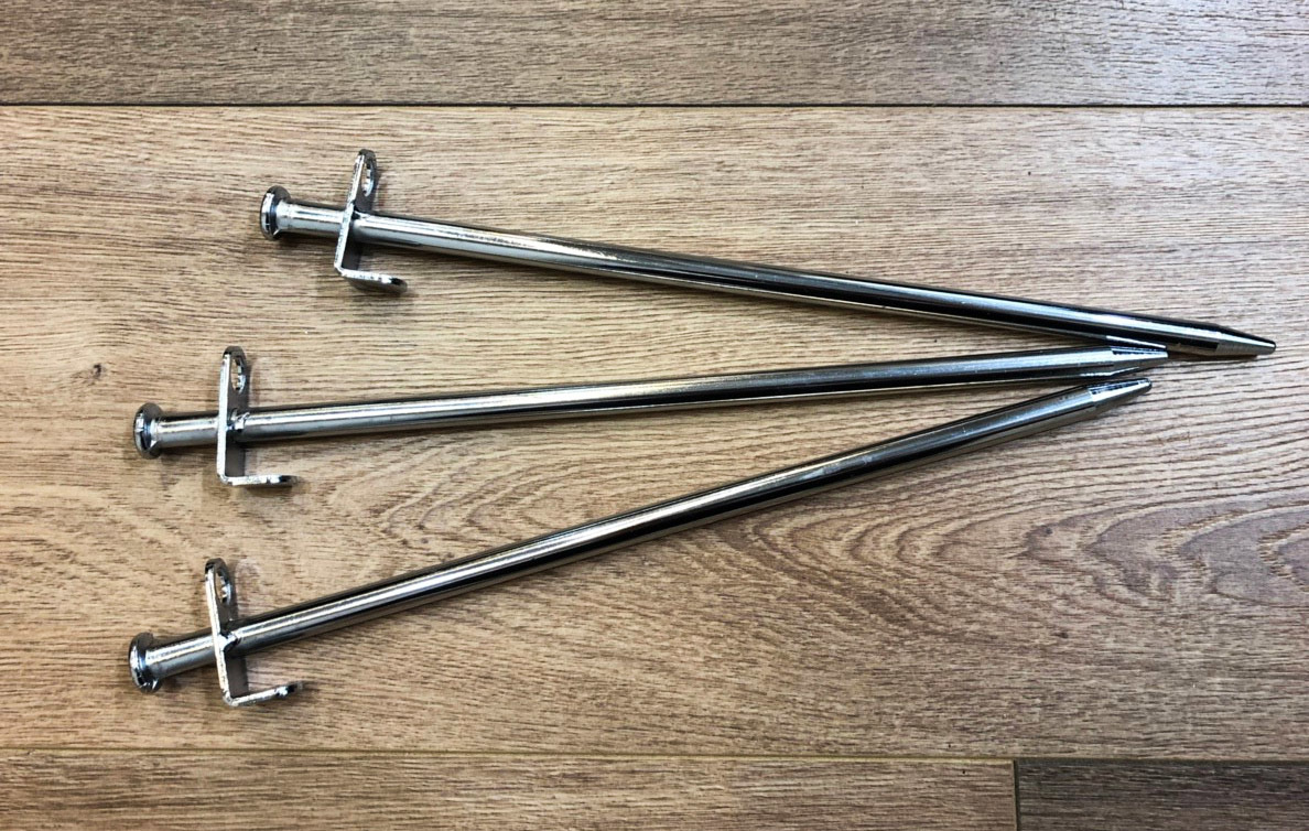 ▲ 準備這種有檔板的大營釘作為桌腳使用,才能夠在不鎖死、保有桌子拆卸收納性的情況下固定住桌腳。