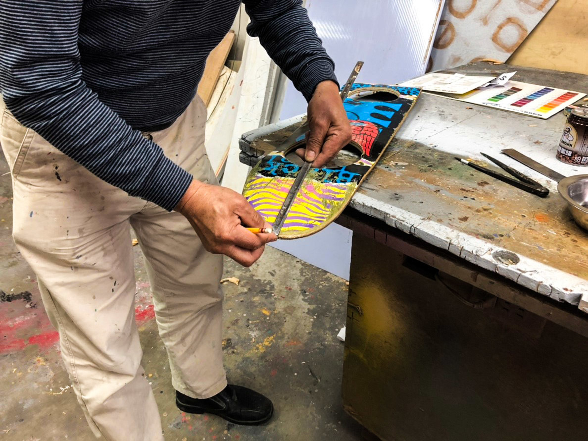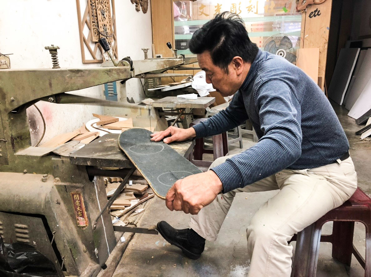這應該是所有步驟最費工夫的一步,滑板是由七層楓木壓製而成的,非常堅硬,不太可能靠自己在家裁切,一般木材行也不太幫忙切這麼精細的洞,一路打聽,才知道可以拿到雕刻社去請師傅裁切。