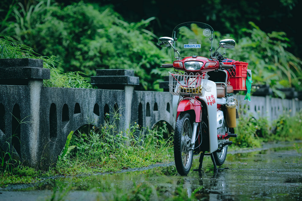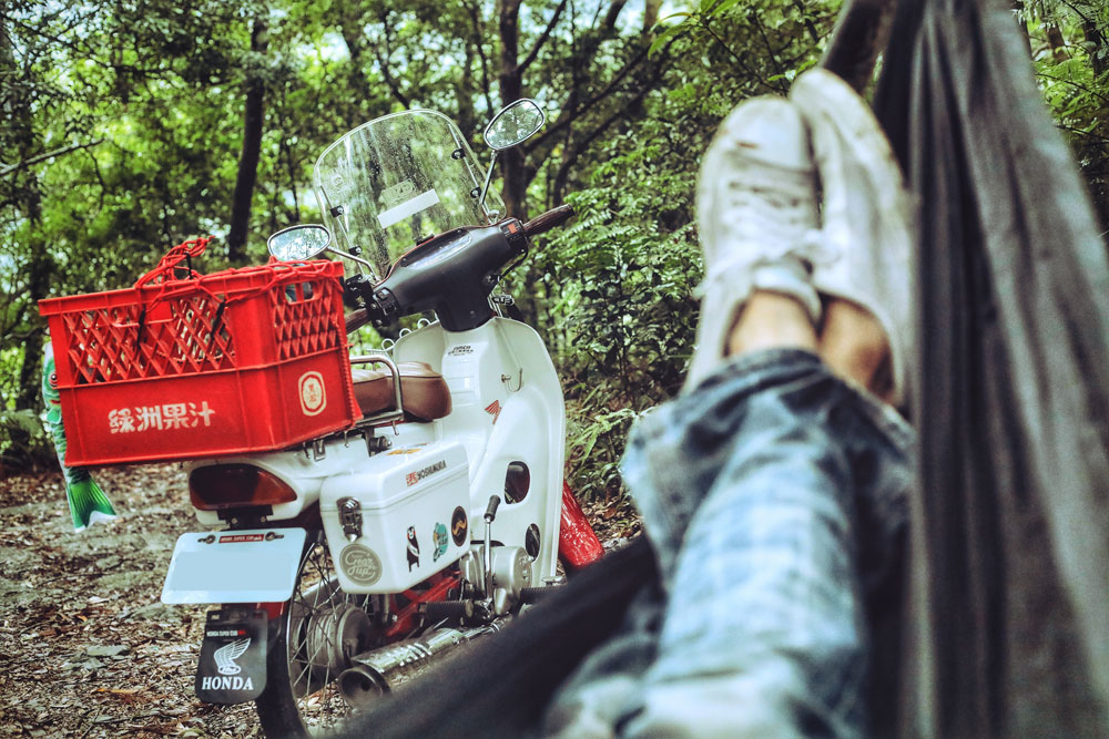 左腳踩一下,發動已經 10 幾歲,有著紅白配色的金旺 100,轟隆隆的引擎聲透過上了年紀的零件發出來,車上載的是大包小包的露營裝備,背著背包的車子主人,扭了油門,往今天的目的地出發。