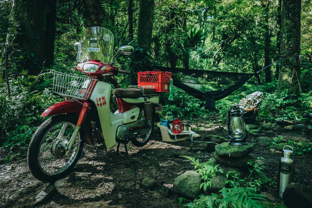 「其實到現在還是會騎這台去買菜啦!」Stewart 笑著說。因為車聚,Stewart 認識了一名熱愛野營的車友,兩人相約一起去羅山林道野營。「我們之前相約跑車就有去過那邊,會選羅山林道是因為之前看過有人在一處轉角,一棵很高的柳杉下露營,覺得很美,所以就決定要去那邊露營看看。」